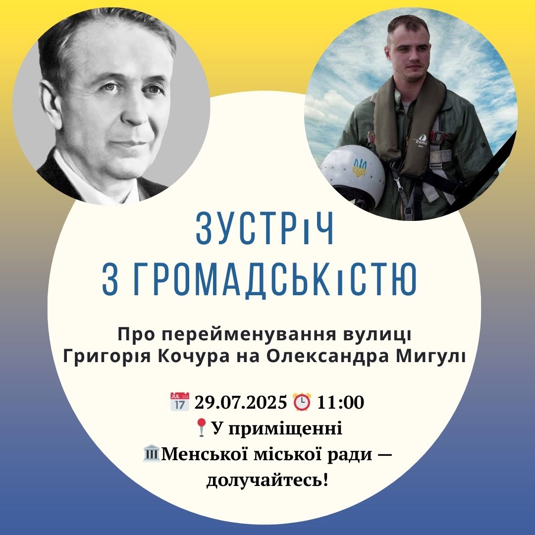 📢 Мешканці Мени! Запрошуємо на громадське обговорення щодо перейменування вулиці. Зустріч присвячена зміні назви вулиці Григорія Кочура на вулицю Олександра Мигули. Ваша думка важлива для формування нашого спільного майбутнього та збереження історичної пам’яті громади.