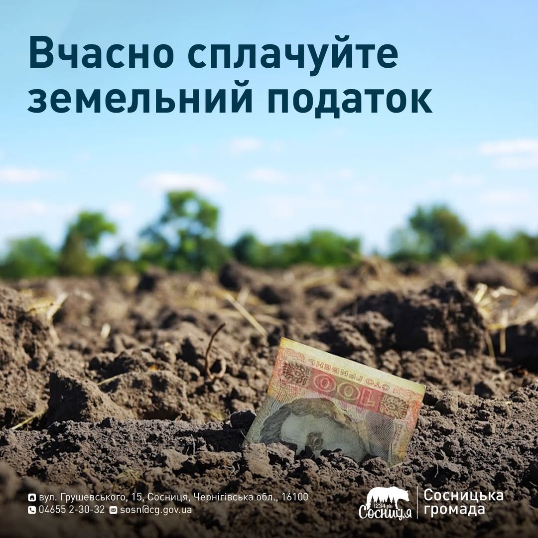 ⚠️ Пам’ятайте, що несвоєчасна сплата земельного податку призводить до нарахування штрафних санкцій. Закликаємо вас здійснити оплату у найкоротші терміни, щоб уникнути додаткових витрат та виконати свої зобов’язання перед державою. Своєчасна сплата податків – це внесок у розвиток громади та країни.