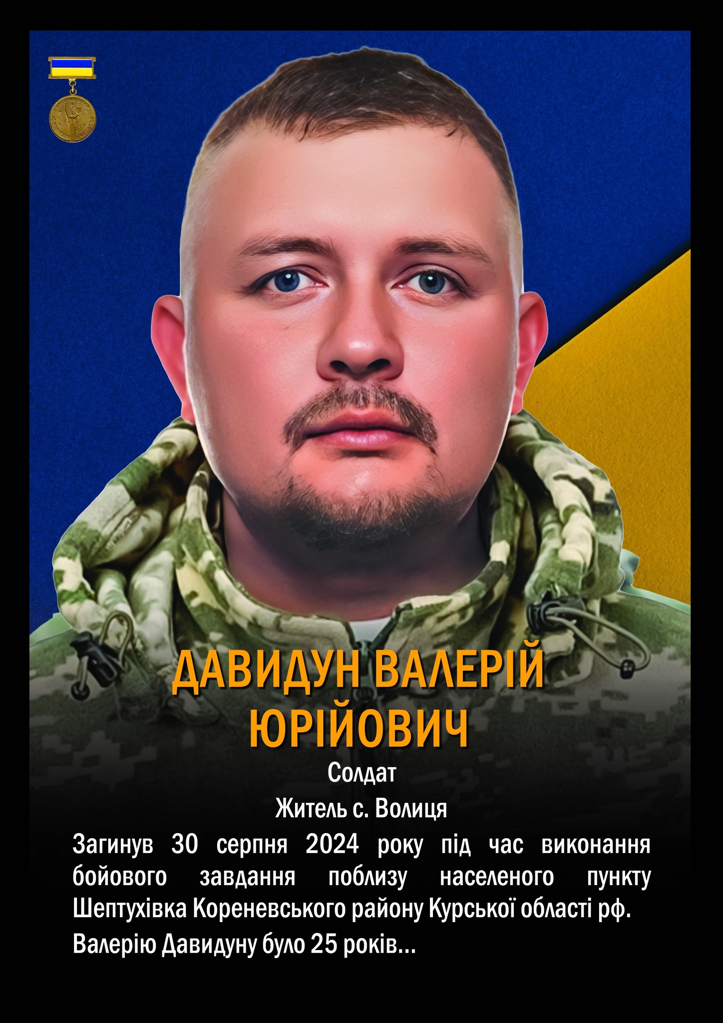 Сьогодні, 30 серпня, минає перший рік з того дня, коли наша громада втратила свого Захисника, людину, чия мужність і відданість назавжди залишаться у наших серцях – солдата Валерія Давидуна. У першу річницю загибелі Воїна секретар міської ради Ірина Морозович разом із начальником відділу у справах ветеранів Романом ОЛІЙНИКОМ, старостою Волицького старостинського округу Валентиною СТОРОЖУК, односельцями та родиною Захисника відвідали його могилу, поклали квіти та вшанували пам’ять хвилиною мовчання. Валерій народився 3 лютого 1999 року в молодій селянській сім’ї. Мама Марія Андріївна виконувала обов’язки домогосподарки, виховуючи двох синів та пораючись коло чималенького господарства. Валерій був молодшим. Батько працював на всіх важких роботах, де тільки можна влаштуватись, щоб якось прогодувати сім’ю. Працювали, як мурашки, не покладаючи рук, щоб діти ні в чому не знали нестатків. Але, на жаль, у 2011 році раптово пішов з життя батько Юрій Петрович. Сім’я залишилась без годувальника і хлопчики стали своїй мамі найбільшою опорою. Їх вмілі руки потяглись до техніки, щоб трохи облегшити важку працю матері на землі. Зростали і навчались у Волицькій загальноосвітній школі. Про дитячий період нашого Героя згадує Олеся Сокол, його сестра і шкільна подруга: «В лікарняній палаті пробивалося сонячне проміння крізь жалюзі і настояне на ліках повітря. Від лагідного дотику сонячного промінця я відкрила повіки і побачила великі голубі очі, що дивилися на мене з таким співчуттям, з такою любов’ю, від якої стає дуже лячно. Біля мого лікарняного ліжка стояв братик Валерик. Мені було сім років, коли я перенесла операцію. Лікар сказав, що потрібно вставати і ходити. Було боляче і боязко. А тут прийшов мій Валерик. Радісний, сміливий і впевнений. Він сказав: «Не бійся, я з тобою, я тебе буду тримати за руку і захищати!». Я йому довіряла завжди. У 9 класі він заявив, що буде пожежником, щоб захищати всіх людей від вогняної стихії. Мріяв бути захисником. Як він пишався, коли був мобілізований до лав ЗСУ у 2018 році. Почувався справжнім воїном, справжнім захисником. Ми його часто жартома так і називали «Наш диво-Давидунчик». Часом наївний, надто довірливий, але завжди надійний, відданий, з відкритим серцем і неймовірних масштабів доброти. Мій брат був справжнім Захисником України і є для мене Героєм назавжди.» Школярем запам’ятався чемним, вихованим та відповідальним. «У Валери був потяг до ручної праці та дисципліни Захист України, – згадує директор школи Сторожук Віктор Петрович, – він любив майструвати, ремонтувати різне приладдя. Його робота по дереву «Георгій Переможець» брала участь у Всеукраїнському конкурсі «Об’єднаймося ж, брати мої!», де його виріб посів призове місце. У школі залишилися його дитячі роботи з вишивання та різьблення. Завжди з відповідальністю та повагою ставився до проведення патріотичних заходів, брав активну участь у вахті пам’яті на День пам’яті та примирення». Після школи обидва брати обрали робітничі професії. У 2016 році Валерій подався до м. Хмельницького навчатись на слюсаря–механіка у Професійно-технічному ліцеї №11. Після його завершення Валерія мобілізували до лав Збройних Сил України. Строкову службу проходив у військовій частині у м. Львів. Після армійської служби пішов працювати в охоронну службу магазину-мар