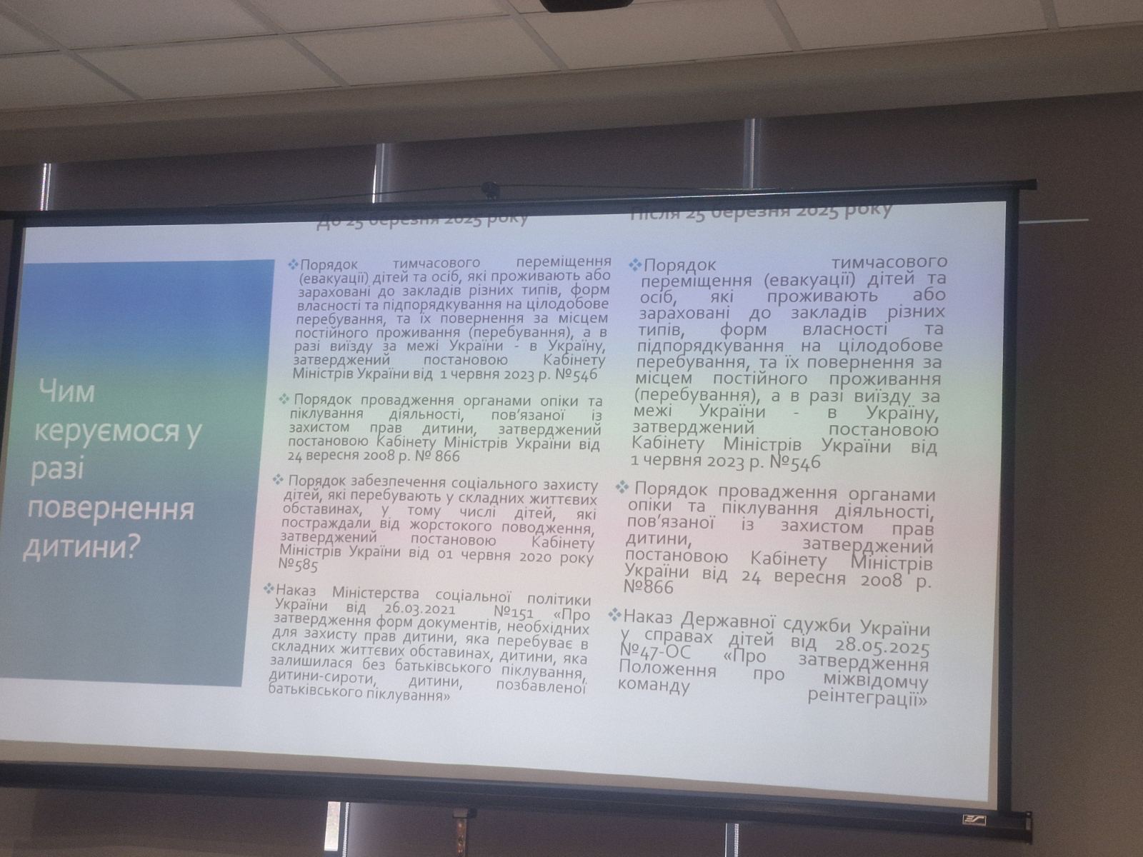 Було детально розглянуто чинне законодавство, яке регулює діяльність органів опіки та піклування стосовно реінтеграції дітей, що повернулися з-за кордону. Особливу увагу приділили основним принципам та підходам до оцінювання потреб дитини. Учасники тренінгу вивчали формування індивідуальних планів реінтеграції, а також механізми соціального захисту дітей, які залишилися без батьківського піклування або опинилися у складних життєвих обставинах. Розглядали особливості оцінки потреб дитини, яка повертається до біологічної родини після евакуації, процес розробки індивідуального плану реінтеграції. Важливими аспектами також стали питання безпеки дитини, запобігання гендерно зумовленому насильству та ефективні методи реагування на нього під час процесу оцінювання та впровадження індивідуальних планів.