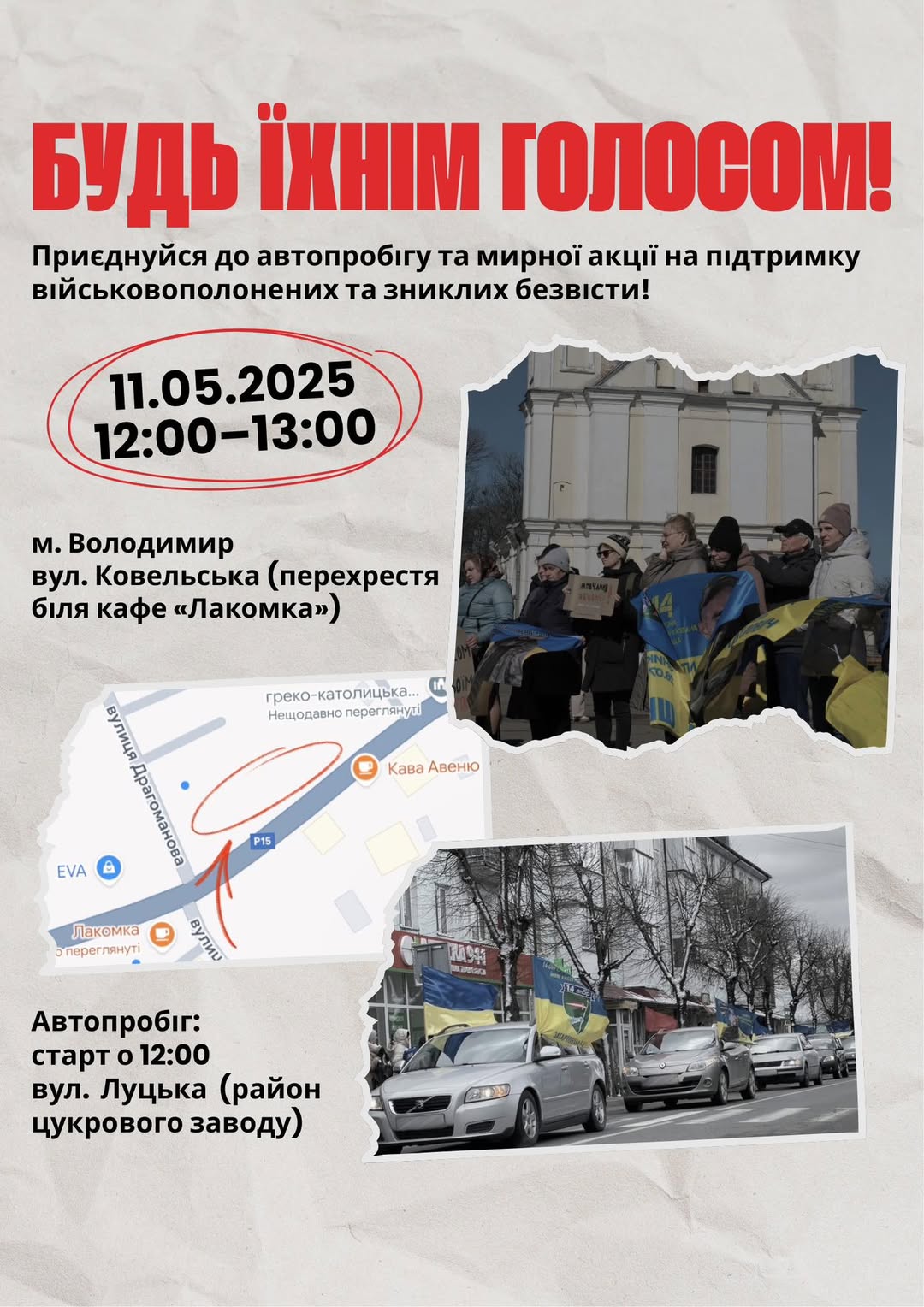📍 Автопробіг стартує о 12:00 з вул. Луцька (район цукрового заводу). Маршрут автопробігу: вул. Луцька – вул. Ковельська – кільце на виїзд з міста (як на Ковель) – вул. Ковельська – вул. Луцька. Учасники автопробігу матимуть змогу висловити свою підтримку та солідарність, проїжджаючи вулицями міста з відповідною символікою та гаслами. Це буде потужний сигнал для всіх, хто чекає на повернення своїх близьких.