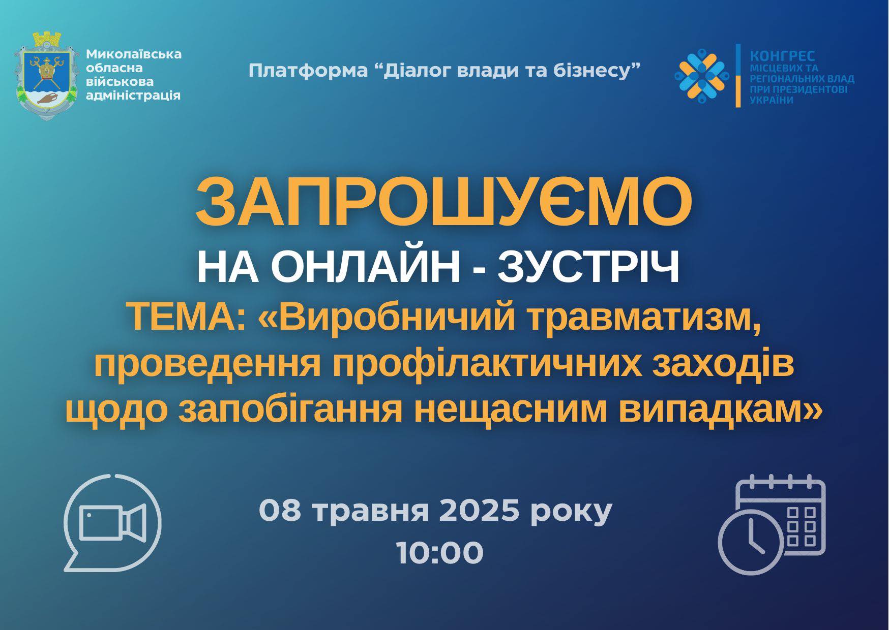 Відділ економіки та інвестиційного розвитку запрошує представників бізнесу долучитися до важливої онлайн-зустрічі на тему виробничого травматизму та профілактики нещасних випадків. Захід відбудеться у четвер, 08 травня, о 10:00, та стане платформою для обміну досвідом і отримання практичних рекомендацій щодо мінімізації виробничих ризиків.