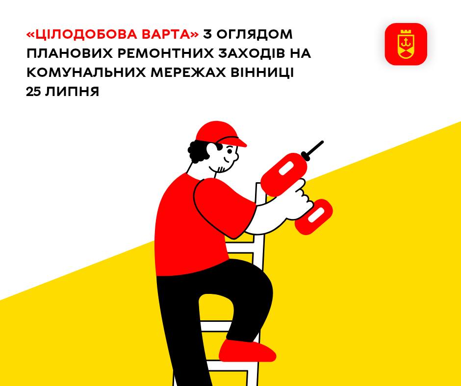 Відділ оперативного реагування «Цілодобова варта» Вінницької міської ради інформує про планові ремонтні роботи на комунальних мережах міста, які відбудуться 25 липня. Ці заходи спрямовані на забезпечення стабільного функціонування інфраструктури та покращення якості послуг для мешканців Вінниці.