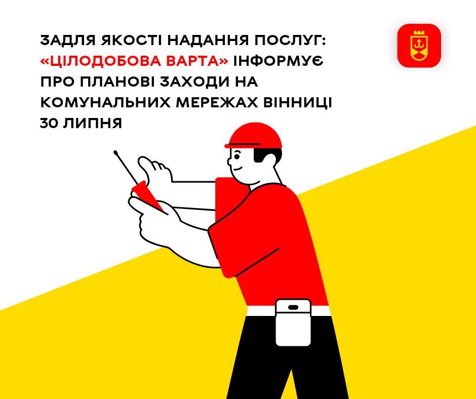 Відділ оперативного реагування «Цілодобова варта» Вінницької міської ради інформує мешканців міста про планові ремонтні роботи на комунальних мережах, що відбуватимуться 30 липня. Ці заходи спрямовані на покращення якості послуг та забезпечення безперебійного функціонування інфраструктури міста.