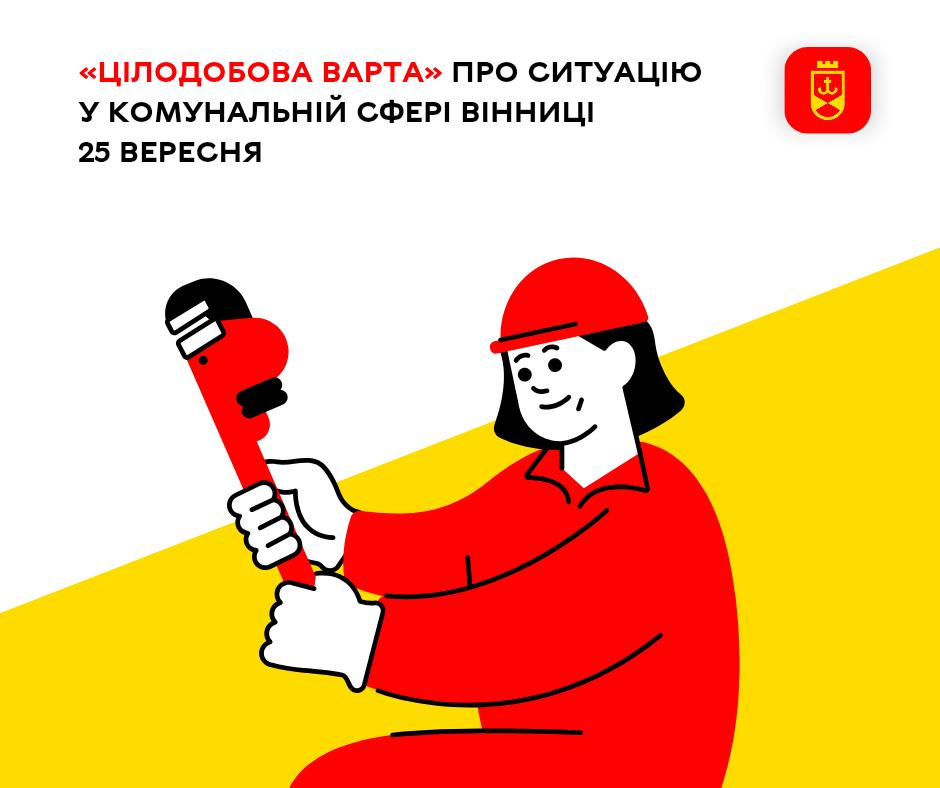 Відділ оперативного реагування «Цілодобова варта» Вінницької міської ради інформує про стан комунальної сфери міста станом на 25 вересня. Роботи з відновлення водопостачання проводяться «Вінницяоблводоканал» за низкою адрес. Зокрема, лагодять водогони на перехрестях вулиць Захисників Неба та проспекту Коцюбинського, а також на перехресті вулиць М. Оводова та Грушевського. Додатково роботи ведуться на вулиці І. Богуна, 136, та на вулиці Ю. Клена, 16. Після завершення ремонтних робіт водопостачання буде відновлено.