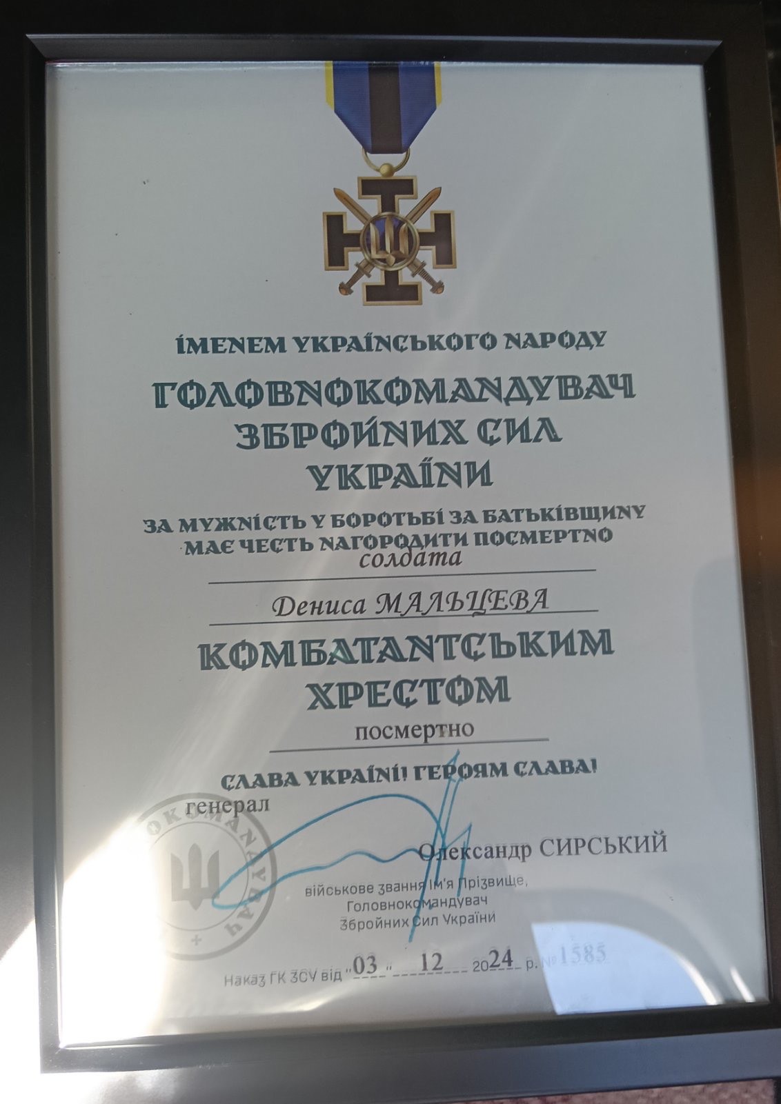 Почесним нагрудним знаком Головнокомандувача Збройних Сил України «Комбатантський хрест» (посмертно) нагрудним знаком «Честь та пам’ять» нагороджено жителя Благовіщенського Мальцева Дениса Андрійовича, який загинув 10 вересня 2023 року у с. Андріївка Бахмутського району Донецької області. Нагороду отримала мати Олена Володимирівна.