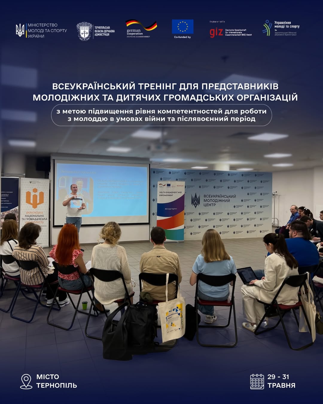 Тренінг організовано Міністерством молоді та спорту України спільно з Тернопільською ОДА, управлінням молоді та спорту Тернопільської ОДА, за підтримки проєкту «EU4Youth: залучення та розширення можливостей молоді», що співфінансується Європейським Союзом та урядом Федеративної Республіки Німеччина.
