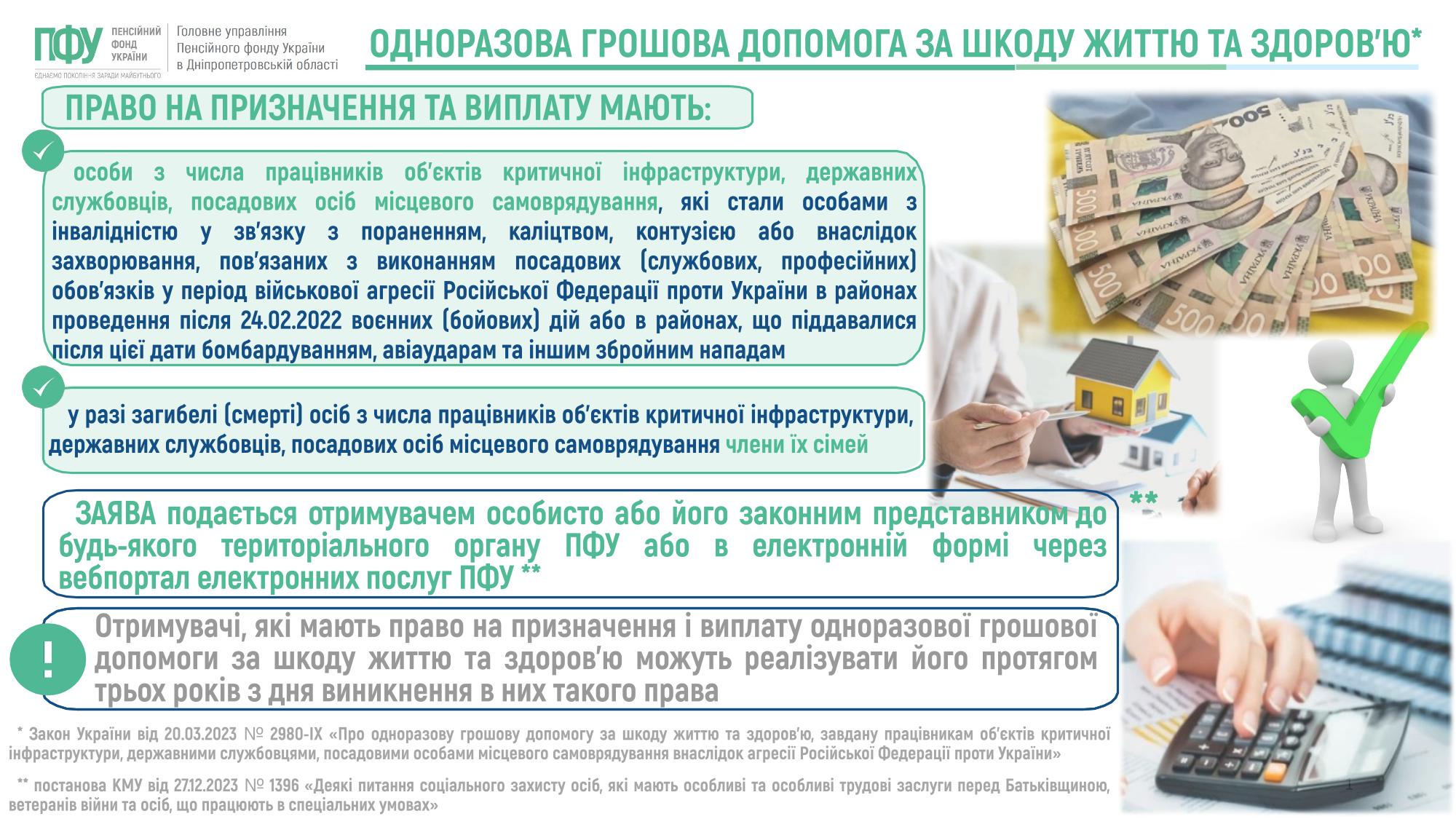 В Україні передбачено надання одноразової грошової допомоги за шкоду життю та здоров’ю, завдану працівникам об’єктів критичної інфраструктури, державним службовцям та посадовим особам місцевого самоврядування внаслідок військової агресії Російської Федерації проти України. Це регулюється Законом України № 2980-IX від 20 березня 2023 року. Детальніше про закон.