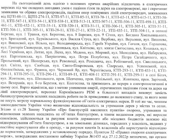 Згідно з листом від Чернігівобленерго, звертаємось до мешканців громади з проханням забезпечити належний стан зелених насаджень. Це необхідно для запобігання аварійним відключенням в електричних мережах, які можуть виникнути під час несприятливих погодних умов, коли гілки та дерева падають на електромережі.