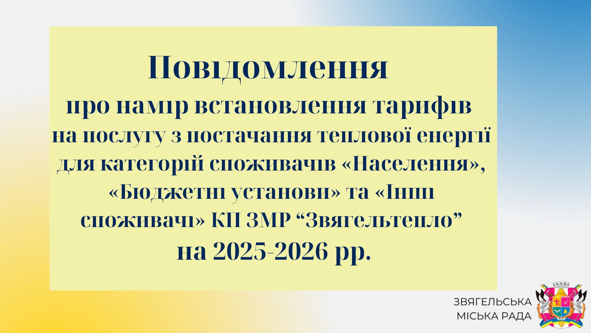 Комунальне підприємство Звягельської міської ради “Звягельтепло” інформує про намір встановлення економічно обґрунтованих тарифів на комунальні послуги, згідно з Порядком інформування споживачів про намір зміни цін/тарифів на комунальні послуги (крім послуг з постачання та розподілу природного газу і з постачання та розподілу електричної енергії) з обґрунтуванням такої необхідності виконавцями комунальних послуг, тарифи для яких встановлюються органами місцевого самоврядування, затвердженого Наказом Міністерства регіонального розвитку, будівництва та житлово-комунального господарства України від 05.06.2018р. № 130. Наразі у м. Звягелі діють тарифи на теплову енергію та послугу з постачання теплової енергії, встановлені рішенням виконавчого комітету Звягельської міської ради від 09.10.2024 № 1289. Посилання на документ: https://info.nvrada.gov.ua/wp-content/uploads/2025/09/taryfy-1.pdf.