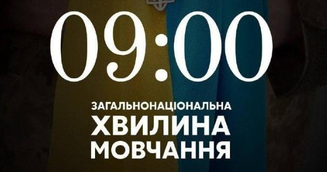 Відповідно до Указу Президента України від 10.03.2022 № 143/2022 «Про загальнонаціональну хвилину мовчання за загиблими внаслідок збройної агресії Російської Федерації проти України» о 9 годині 00 хвилин проводиться загальнонаціональна хвилина мовчання.