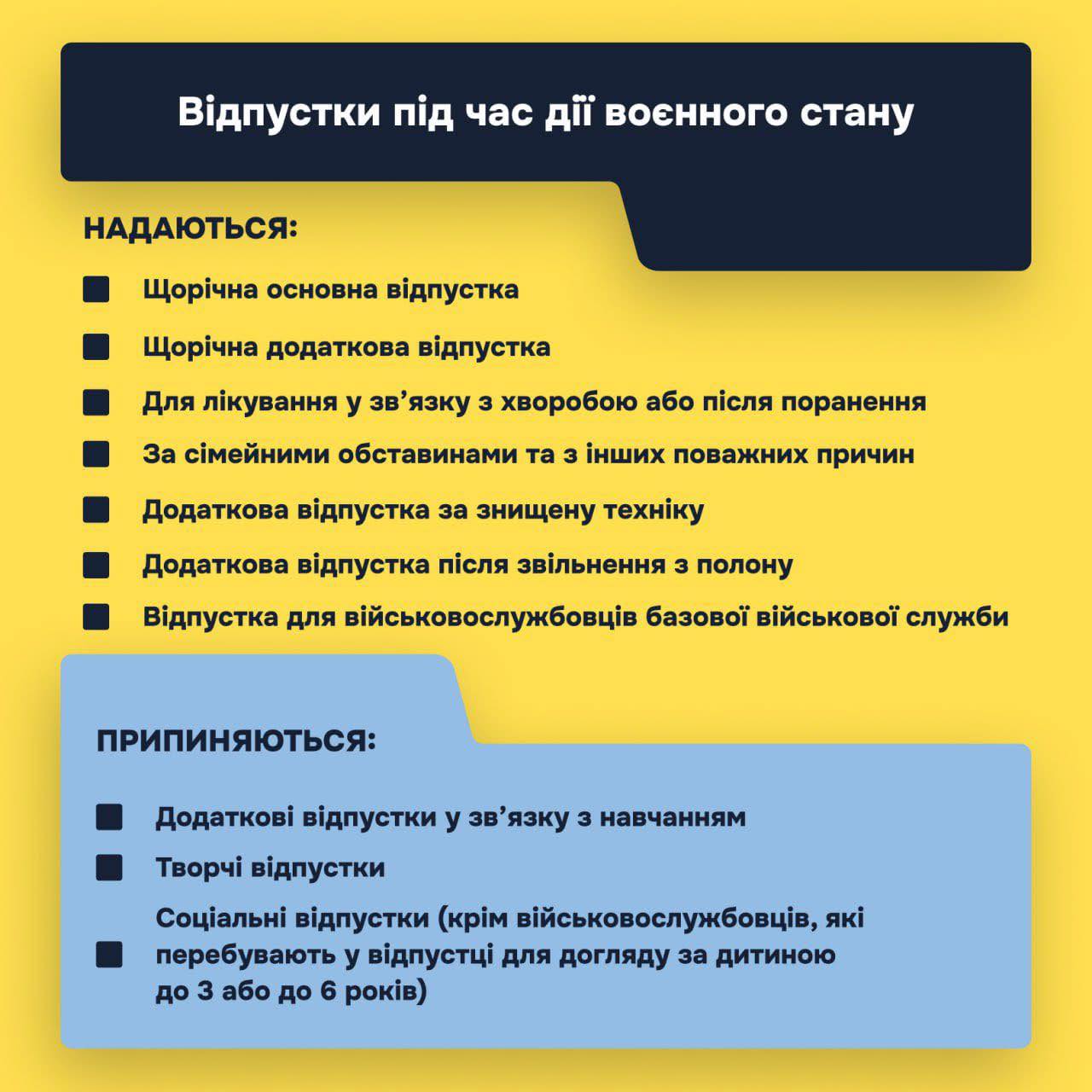 Відпустки, надання яких припиняється під час дії воєнного стану:
