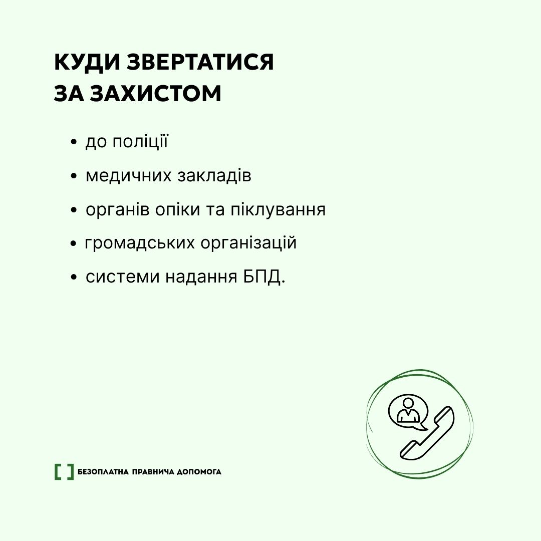Отримайте безкоштовну юридичну консультацію щодо домашнього насильства. Телефонуйте на гарячу лінію або звертайтеся до бюро правничої допомоги. Ваші права мають бути захищені. Не мовчіть про домашнє насильство!