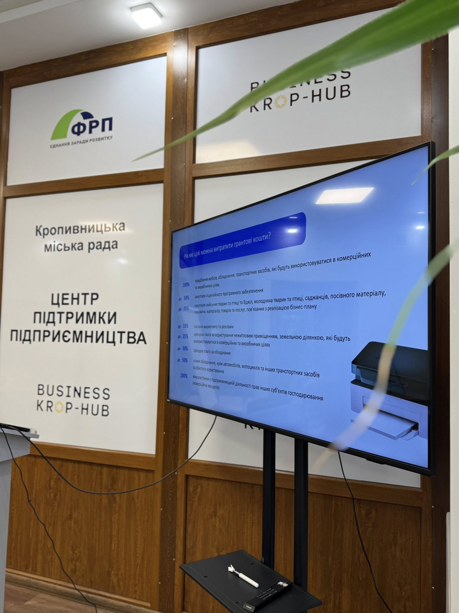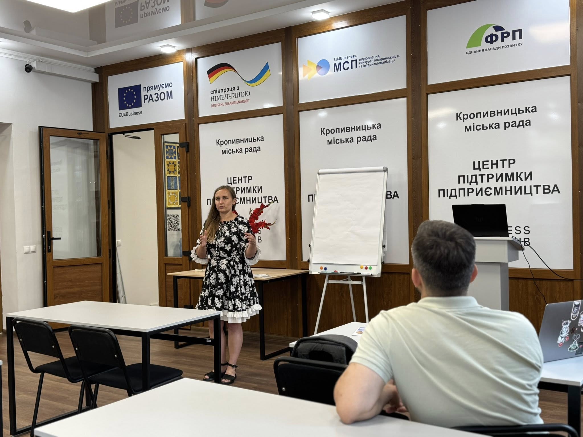 Другу частину зустрічі провела Наталія Старосадча, консультантка Кропивницької філії обласного центру зайнятості. Вона детально розповіла про державну грантову програму «єРобота», яка надає безповоротну фінансову допомогу ветеранам та членам їхніх сімей. Ця програма дозволяє започаткувати або масштабувати бізнес за підтримки держави до одного мільйона гривень.