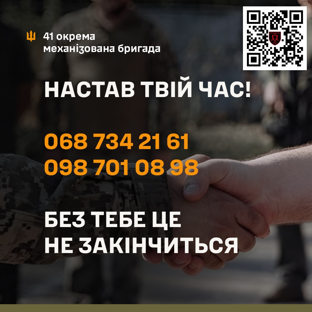 Війна – це жорстока реальність, а не гра чи кіно. Вона може прийти у кожен дім, приносячи з собою втрати та руйнування. Але у вас є можливість протистояти цій біді та захистити свою країну. 41 окрема механізована бригада, яка пройшла важкі бої від Харківщини до Курської операції, запрошує патріотів на військову службу. Нам потрібні віддані стрільці, надійні зв’язківці, кваліфіковані оператори БПЛА, досвідчені сапери, відповідальні водії та уважні санітари. Кожен, хто прагне захищати Україну, знайде своє місце в наших лавах.