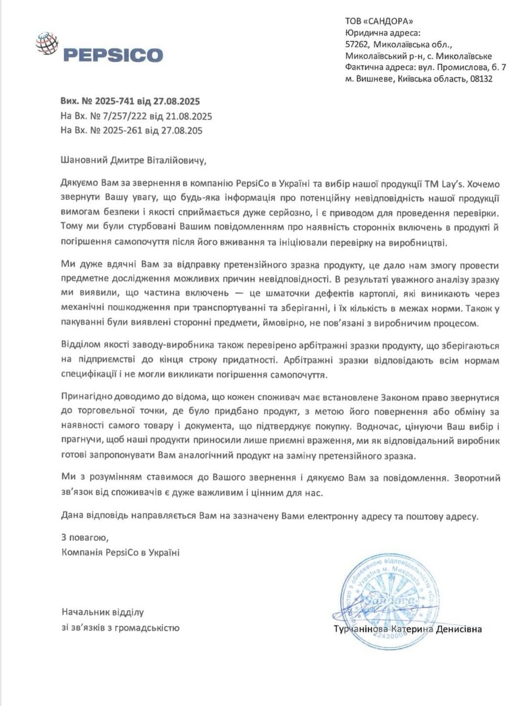 Реакція компанії PepsiCo на скаргу виявилася обуреною для військового. У відповіді компанії, скріншот якої також був опублікований, зазначено, що «у пакуванні були виявлені сторонні предмети, ймовірно, не пов’язані з виробничим процесом». Натомість компанія запропонувала Дмитру Куриловичу «аналогічний продукт на заміну претензійного зразка».