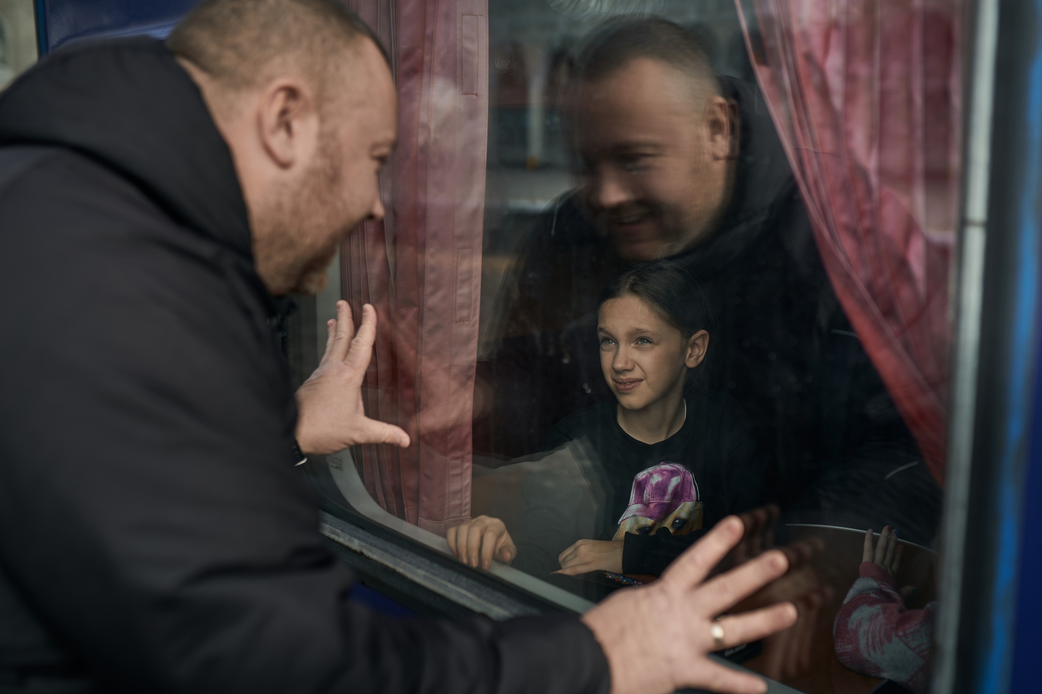 Капелан, щоденно ризикуючи власним життям, евакуює цивільних із небезпечних зон. Його рука, що підтримує літню жінку, яка погоджується залишити рідний дім у Покровську, – це втілення турботи й людяності. Цей дотик транслює непохитну віру в порятунок і підтримку.