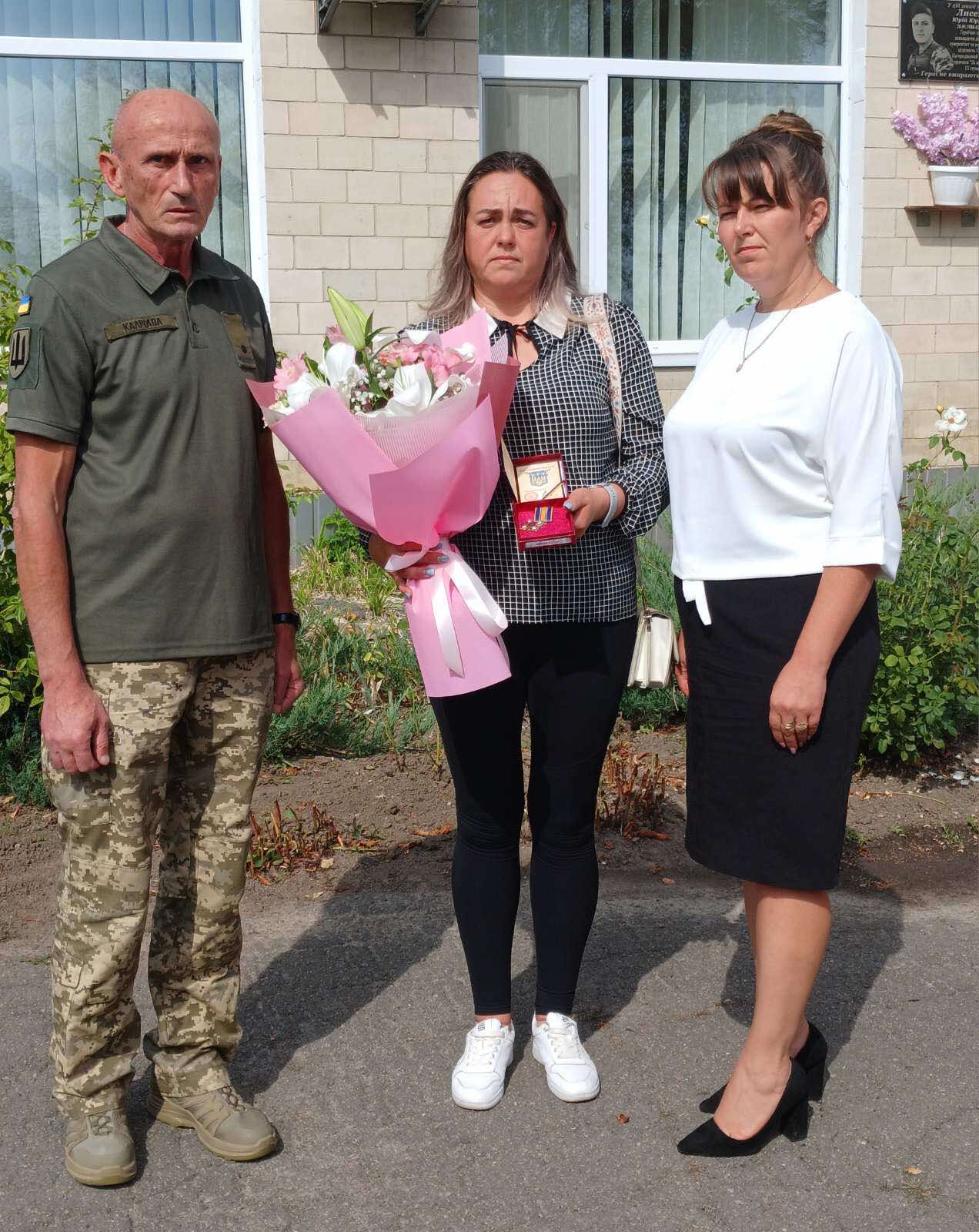 Сьогодні, 10 вересня, заступник командира інженерно-саперного батальйону з психологічної підтримки персоналу, майор Калічава Годердзі Геніелович, спільно зі старостою Васильківського старостинського округу Оленою Овсяник, урочисто передали почесну нагороду дружині загиблого Героя – Аліні Вікторівні.
