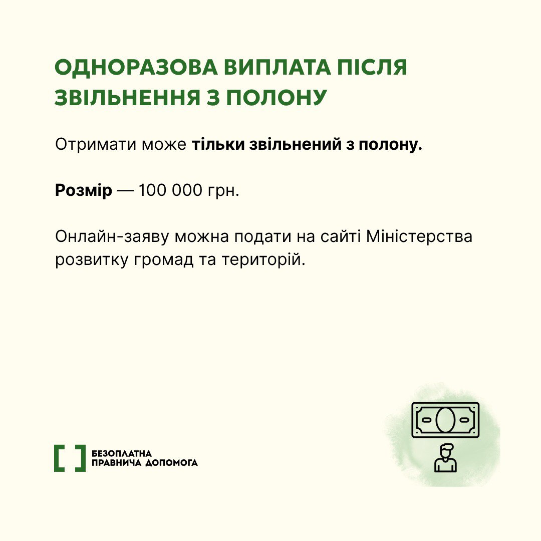 * **Одноразові виплати:** Передбачені також певні одноразові допомоги, які нараховуються у зв’язку з перебуванням у полоні.