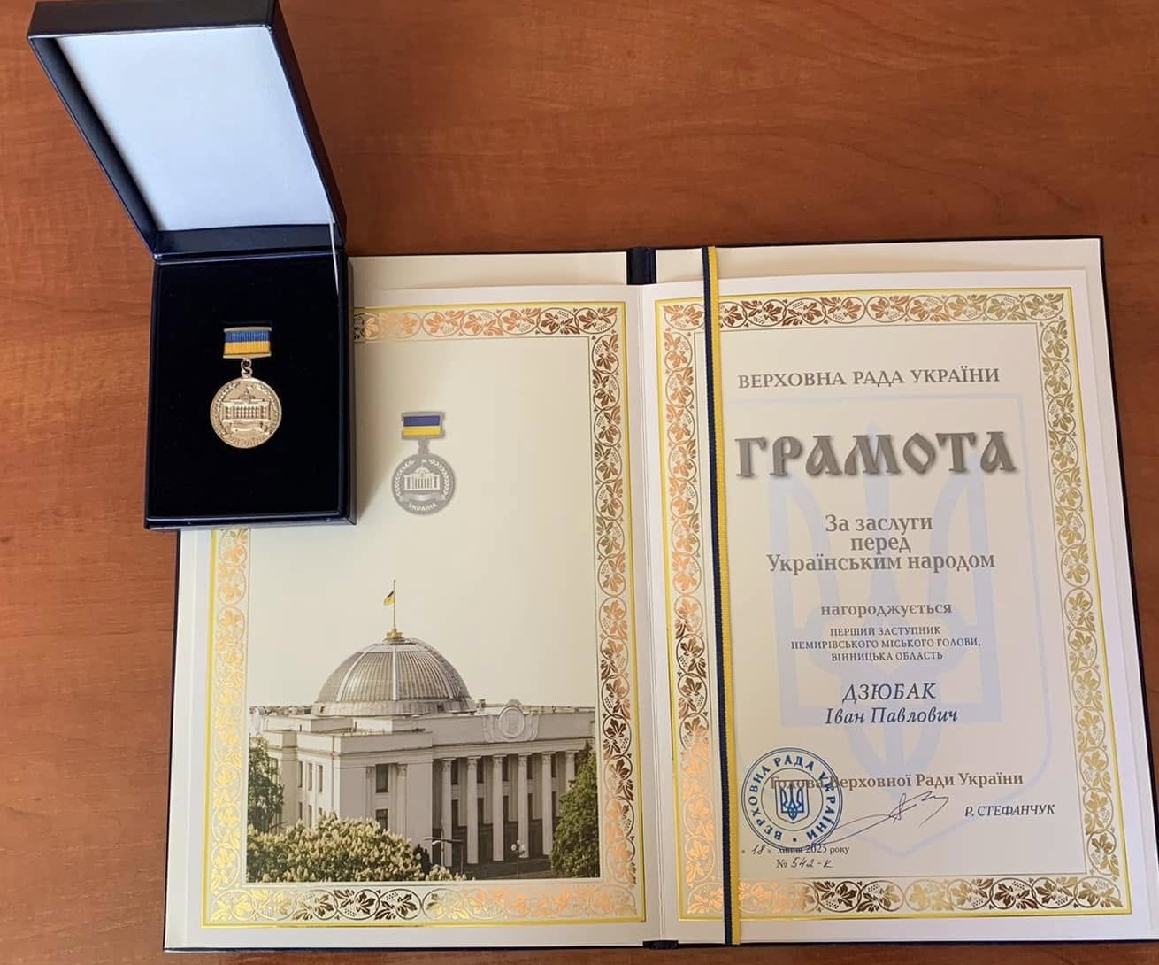 🔸Днями, відповідно до Постанови Верховної Ради України № 2541, першого заступника Немирівського міського голови Івана Павловича Дзюбака відзначено Грамотою Верховної Ради України. Ця висока відзнака надана за вагомий особистий внесок у розвиток місцевого самоврядування, соціально-економічний розвиток регіону, активну громадську і благодійну діяльність, а також за високий професіоналізм та сумлінну працю.