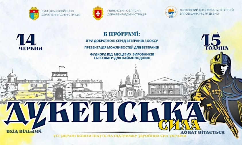 Відвідайте благодійний захід «Дубенська сила» та підтримайте наших захисників! Кожна гривня має значення. Дубенська сила – це символ єдності та незламності. Долучайтеся до Дубенської сили, разом ми зможемо більше! Підтримайте наших воїнів, відвідавши захід Дубенська сила. Зробимо свій внесок у Дубенську силу!