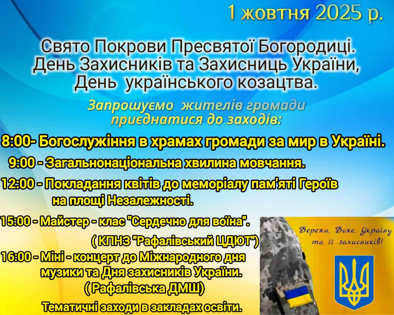 Запрошуємо всіх мешканців громади долучитися до заходів, присвячених цим знаменним святам, які відбудуться на території нашої громади. Ваша присутність та підтримка є надзвичайно важливими.