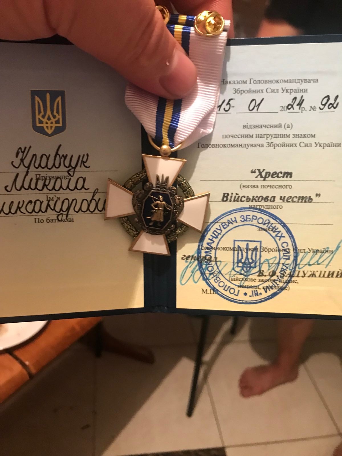 Особливо вагомою подією стало те, що у січні 2024 року, за особисту відвагу та героїзм, Микола Кравчук був відзначений наказом Головнокомандувача Збройних Сил України Валерія Залужного. Йому було вручено почесний нагрудний знак “Хрест Військова честь”. Цю високу відзнаку він отримав особисто з рук Головнокомандувача, що є визнанням його видатних заслуг.