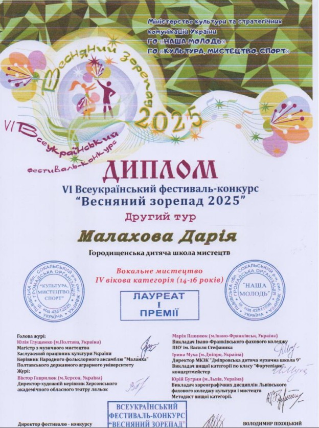 Разом з тим, висловлюємо вдячність організаторам Всеукраїнського фестивалю-конкурсу мистецтв «Весняний зорепад 2025» за чудову можливість для молодих талантів продемонструвати свій потенціал. Такі заходи сприяють розвитку вокального мистецтва та культурному збагаченню нашої країни.