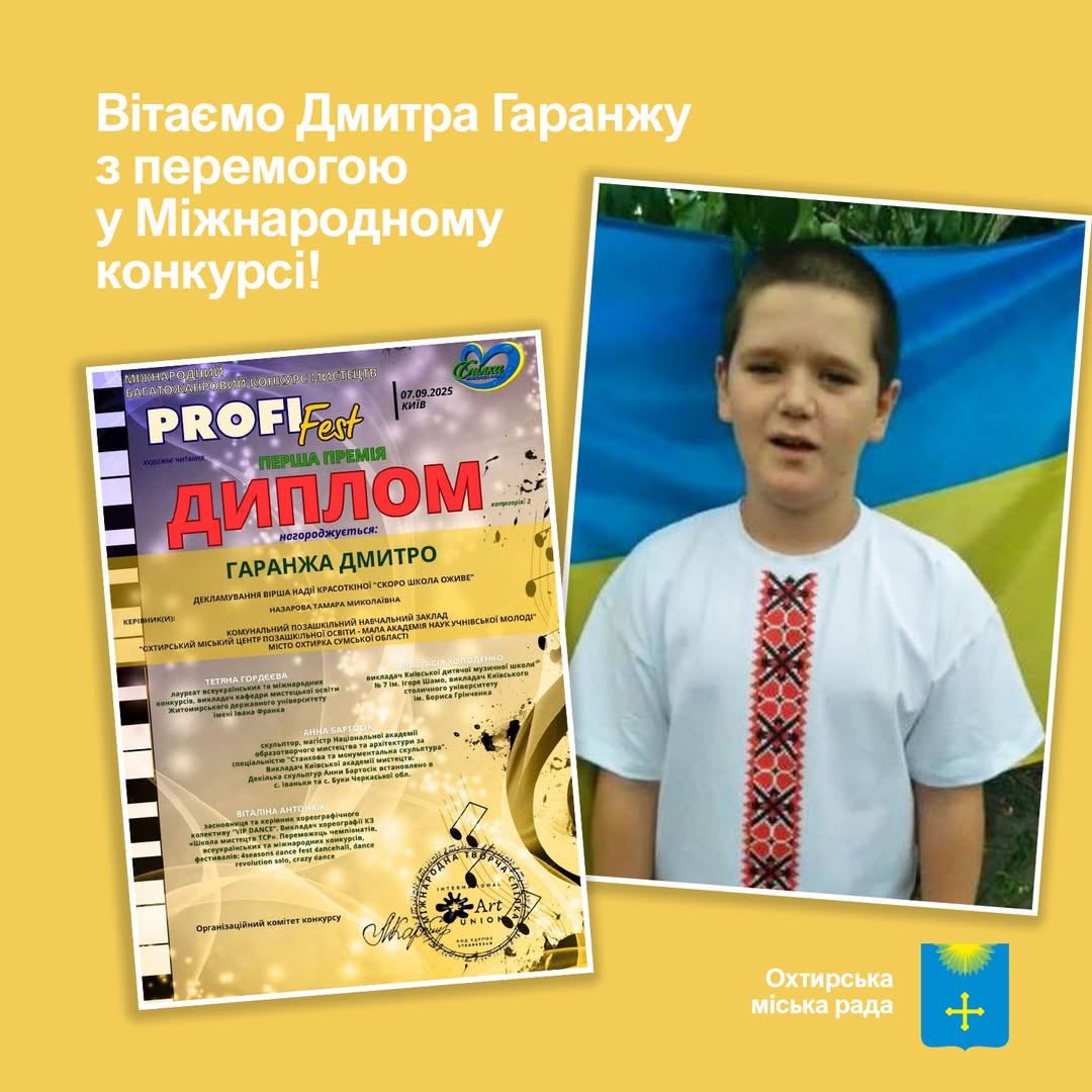 📌 Вихованець гуртка «Креативне рукоділля» (керівник Тамара НАЗАРОВА) Охтирського міського центру позашкільної освіти-Мала академія наук учнівської молоді Охтирської міської ради Дмитро ГАРАНЖА здобув І Премію у Міжнародному конкурсі «PROFI Fest» (м. Київ, 07.09.2025) у номінації «Художнє читання». Це значне досягнення для юного таланту з Охтирки.