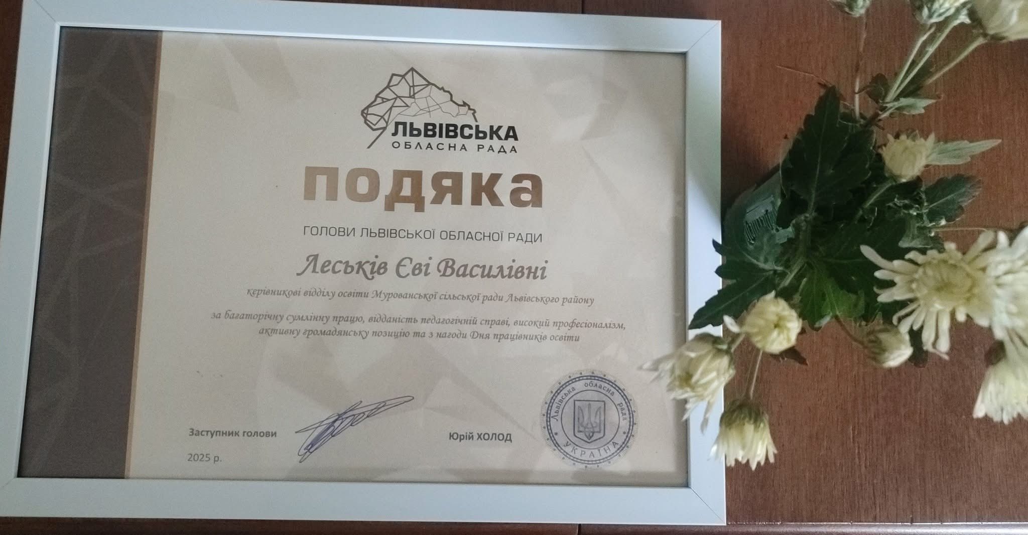 Шановні мешканці громади та колеги! Сьогодні ми з гордістю вітаємо Єву Леськів, очільницю Відділу Освіти Мурованської сільської ради Територіальної громади, з її професійним святом. Особливо приємно відзначити, що ця знаменна подія співпадає з врученням їй заслуженої Подяки від голови Львівської обласної ради. 🌟