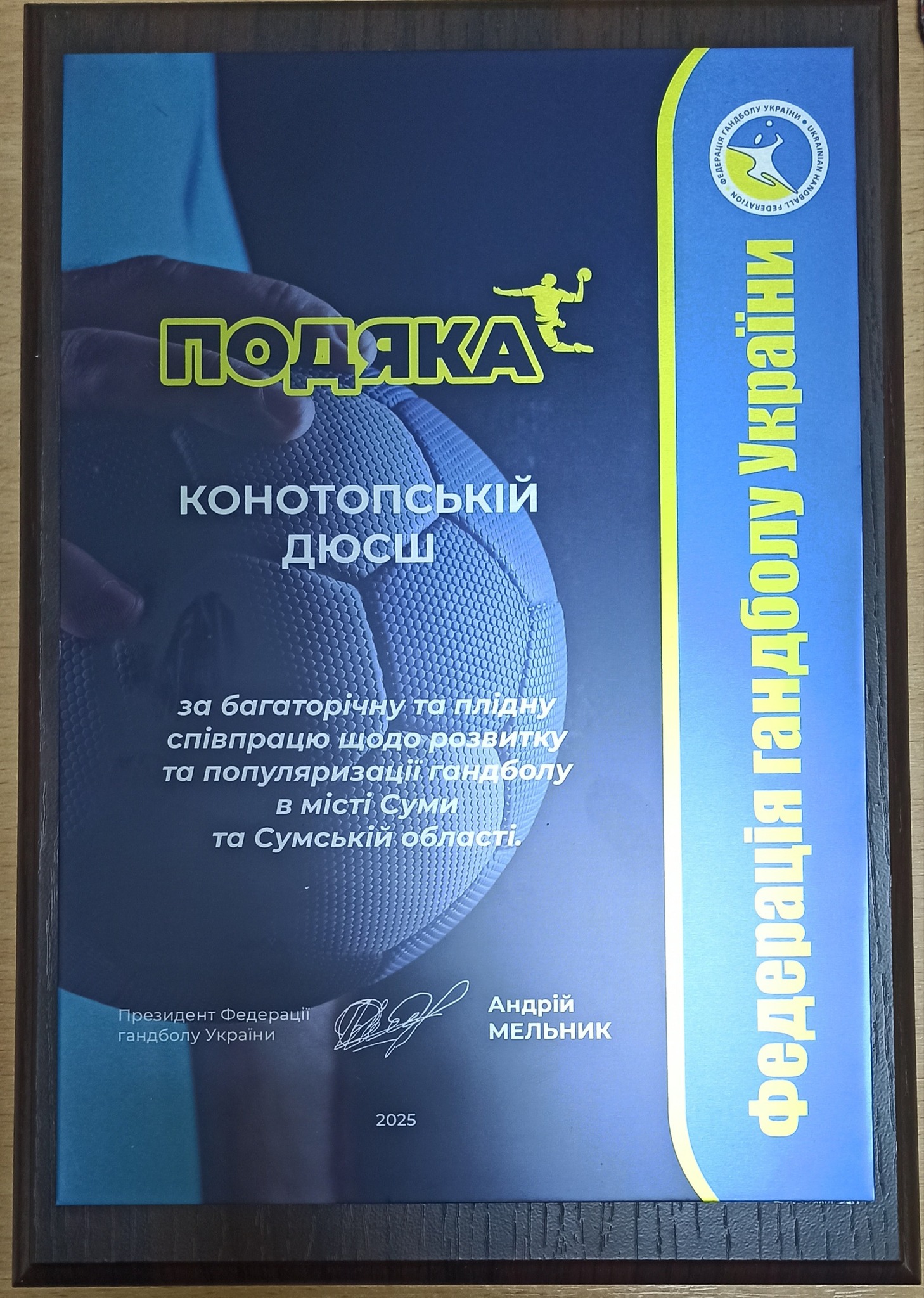 Вітаємо Конотопську ДЮСШ, особливо відділення гандболу, з отриманням заслуженої подяки від Федерації гандболу України за значний внесок у розвиток гандболу в Сумській області. Це визнання є результатом наполегливої праці тренерів відділення: Олександра Паламарчука, Андрія Шатрави та Альони Нічик. Їх відданість справі та професіоналізм сприяють вихованню талановитих спортсменів.