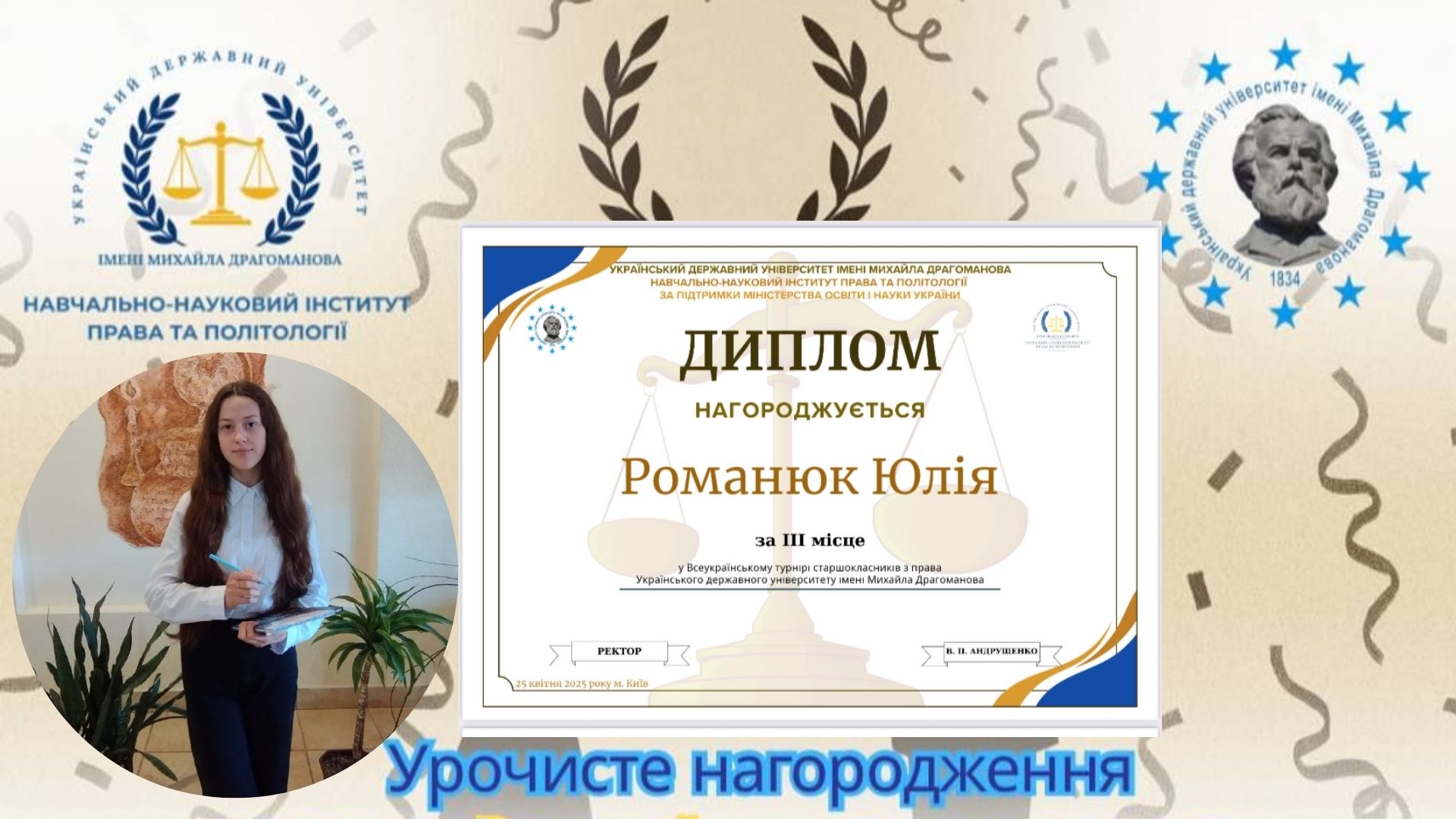 Всеукраїнський турнір, організований Українським державним університетом імені Михайла Драгоманова, об’єднав понад 1000 учасників — школярів та студентів, які вміють критично мислити, аргументовано відстоювати свою позицію, діяти в межах закону та задля утвердження справедливості. Змагання тривало протягом березня-квітня 2025 року. Його головною метою було не лише популяризувати правничі професії, а й формувати в молоді активну громадянську позицію, здатність захищати права людини та розбудовувати Україну як правову державу.