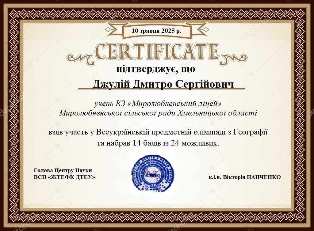 Окрім того, Джулій Дмитро, учень 11 класу, отримав Сертифікат учасника, що є свідченням його наполегливості та інтересу до географії.