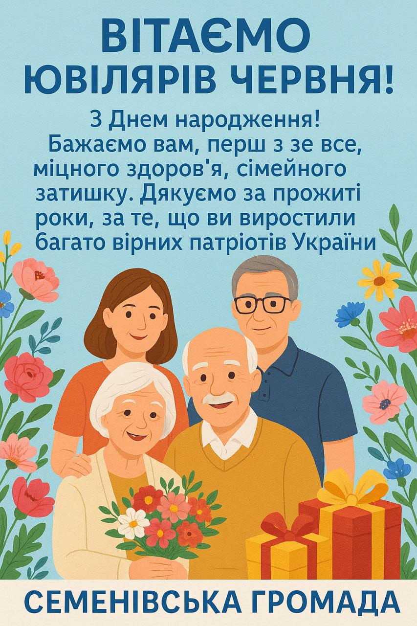Вітаємо ювілярів червня!Семенівська громада щиро вітає всіх своїх шанованих мешканців, хто святкує знаменні ювілеї цього теплого червневого місяця! Ці урочисті дати – це не лише особисте свято, а й важлива подія для всієї нашої спільноти, адже кожен ювіляр – це невід’ємна частина історії та сьогодення Семенівської громади. Ми з великою повагою ставимося до кожного, хто своїми добрими справами, мудрістю та досвідом збагачує наше життя.Міцного здоров’я вам, дорогі наші поважні ювіляри, родинного тепла, любові та затишку у ваших домівках. Нехай кожен новий день приносить лише радість, натхнення і глибокий мир у серці. Ми бажаємо вам ще багато світлих років у колі рідних та близьких, наповнених щасливими моментами та приємними подіями.Ми щиро дякуємо вам за прожиті роки, за ваш неоціненний досвід, життєву мудрість і численні добрі справи, що ви зробили на благо Семенівської землі. Особлива подяка за те, що ви виростили нові покоління – вірних патріотів України, передаючи їм свою щиру любов до рідної землі, її традицій та цінностей. Ви – наша велика гордість, надійна опора та невичерпне джерело натхнення для всіх нас, мешканців Семенівки.Нехай ваші домівки завжди будуть наповнені щастям, сміхом та любов’ю, а поруч завжди будуть рідні люди, готові розділити з вами радість та підтримати у будь-яку мить. Ці червневі ювіляри є яскравим прикладом гідного життя, відданості та любові до рідного краю.З особливою радістю Семенівська громада вітає наступних ювілярів червня:1 червня з 65річчям – Якимчук Валентину Леонідівну, жительку села Терехове;4 червня з 70річчям – Масана Павла Степановича, жителя села Закутинці;4 червня з 70річчям – Мищик Ларису Миколаївну, жительку села Великі Нізгірці;04 червня з 60річчям – Стирник Наталію Валерянівну , жительку села Хажин;4 червня з 65річчям – Чорноусs Володимира Івановича, жителя села Дубівка;6 червня з 65річчям – Дзюбаненка Віктора Григоровича, жителя села Великі Нізгірці;7 червня з 50річчям – Калінчука Віктора Степановича, жителя села Дубівка;8 червня з 60річчям – Хмільовську Світлану Анатоліївну, жительку села Закутинці;10 червня з 60річчям – Хмільовську Валентину Миколаївну, жительку села Закутинці;11 червня з 60річчям – Шамрай Валентину Вікторівну, жительку села Хажин;12 червня з 65річчям – Камінську Світлану Володимирівну, жительку села Іванківці;12 червня з 55річчям – Куліш Наталію Петрівну, жительку села Красівка;13 червня з 60річчям – Орлівського Степана Степановича, жителя села Семенівка;13 червня з 70річчям – Павліківського Станіслава Йосиповича, жителя села Хажин;14 червня з 70річчям – Лисак Ларису Костянтинівну, жительку села Семенівка;15 червня з 70річчям – Мостову Галину Іванівну, жительку села Великі Нізгірці;17 червня з 70річчям – Усольцеву Софію Іванівну, жительку села Великі Гадомці;20 червня з 70річчям – Паламарчук Віру Андріївну, жительку села Кикишівки;21 червня з 60річчям – Бєлякова Юрія Олександровича, жителя села Хажин;23 червня з 70річчям – Прищепу Галину Феодосіївну, жительку села Малі Гадомці;24 червня з 70річчям – Горбунову Людмилу Петрівну, жительку села Кикишівки;24 червня з 91річчям – Івашкевич Галину Степанівну, жительку села Хажинн;26 червня з 75річчям – Гераймовича Миколу Івановича, жителя села Семенівка;26 червня з 75річчям – Скальську Генефу Іванівну, жительку села Хажин;29 червня з 6