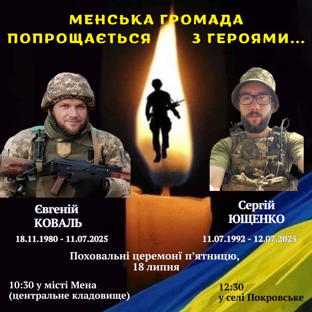 🔹 О 10:30 громада міста Мени прощатиметься з Сергієм Ющенком. Церемонія відбудеться на центральному кладовищі міста, де близькі, друзі та побратими зможуть віддати останню шану полеглому воїну.