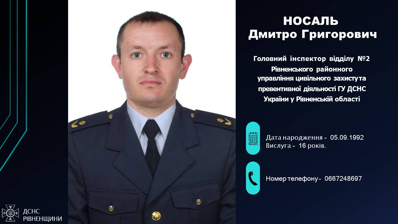 Представляємо вам Носаля Дмитра Григоровича, головного інспектора відділу №2 Рівненського районного управління цивільного захисту та превентивної діяльності ГУ ДСНС України у Рівненській області. Він призначений офіцером-рятувальником для Городоцької, Олександрійської та Білокриницької сільських територіальних громад. Його досвід та професіоналізм стануть надійним щитом для мешканців.
