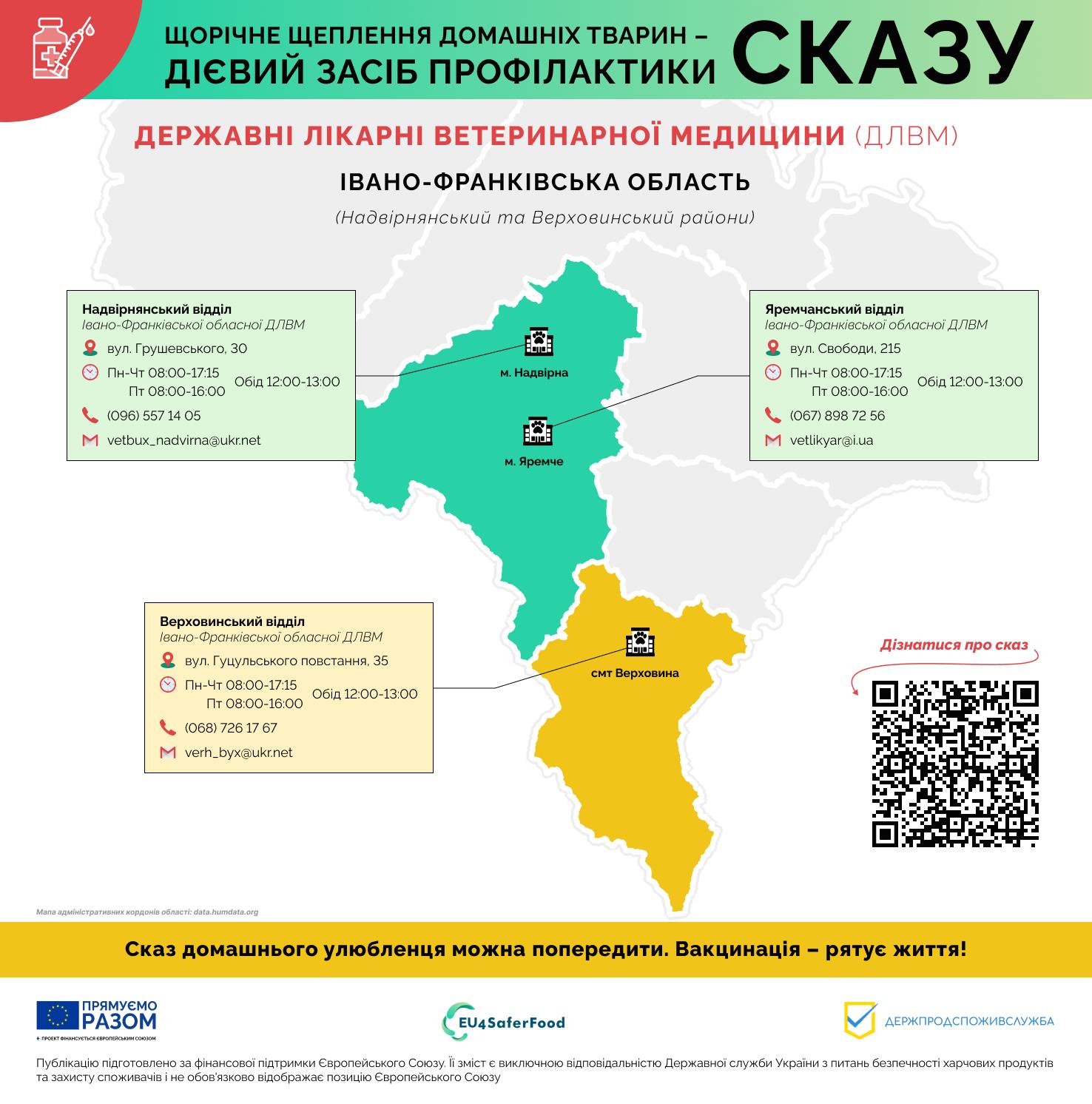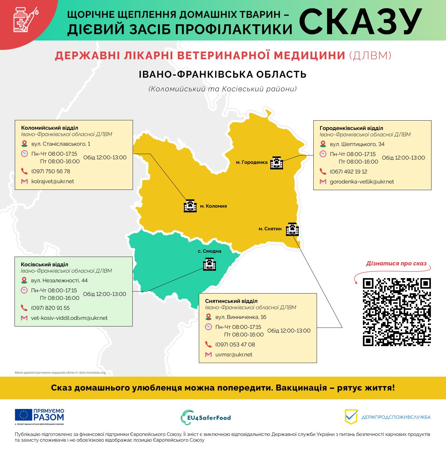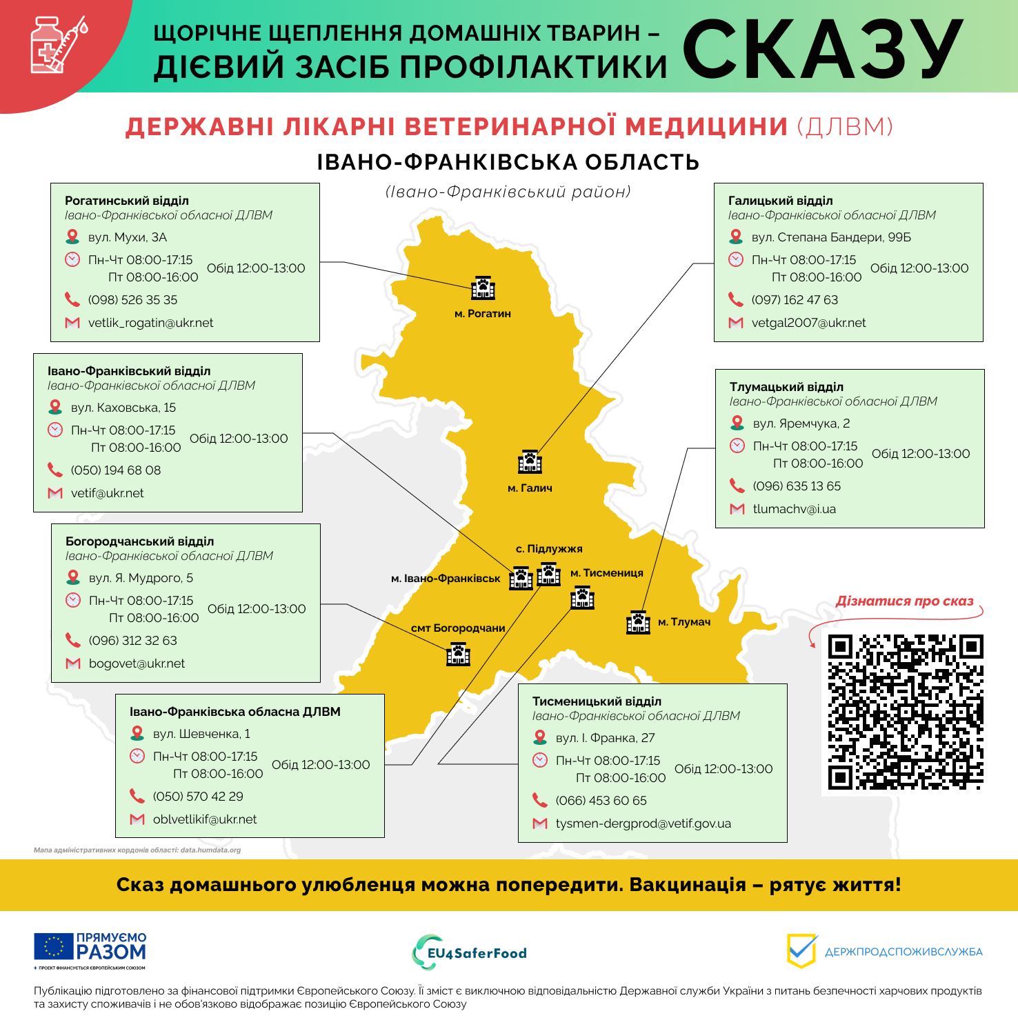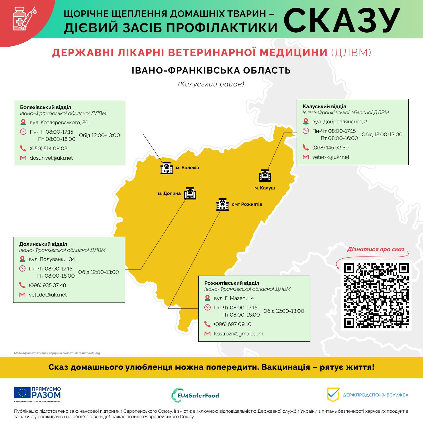 Вакцинація проти сказу в державних лікарнях ветеринарної медицини Держпродспоживслужби є безкоштовною. Скористайтеся цією можливістю, щоб забезпечити безпеку свого пухнастика. Для вашої зручності ми зібрали контактну інформацію про структурні підрозділи Івано-Франківської обласної державної лікарні ветеринарної медицини. Зверніться до найближчої клініки, зателефонуйте та запишіться на прийом. Це простий і ефективний спосіб захистити здоров’я вашого улюбленця, а також ваше власне та здоров’я ваших близьких. Не відкладайте турботу про найменших членів вашої родини на потім. Здоров’я вашого улюбленця – це ваша відповідальність, а ми готові допомогти вам її виконати. Звертайтесь до наших фахівців, які нададуть кваліфіковану допомогу та консультації щодо вакцинації та догляду за тваринами. Профілактика – це запорука довгого та щасливого життя вашого компаньйона. Головне управління Держпродспоживслужби в Івано-Франківській області