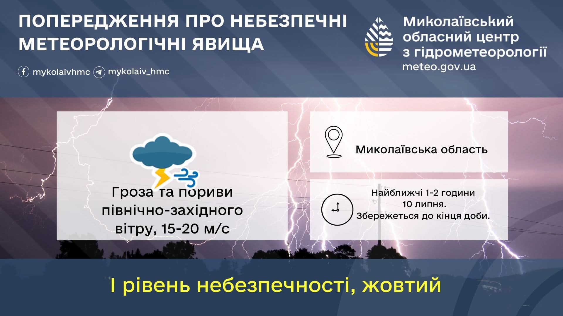 та Миколаївській області очікується гроза та посилення північно-західного вітру, 15-20 м/с.