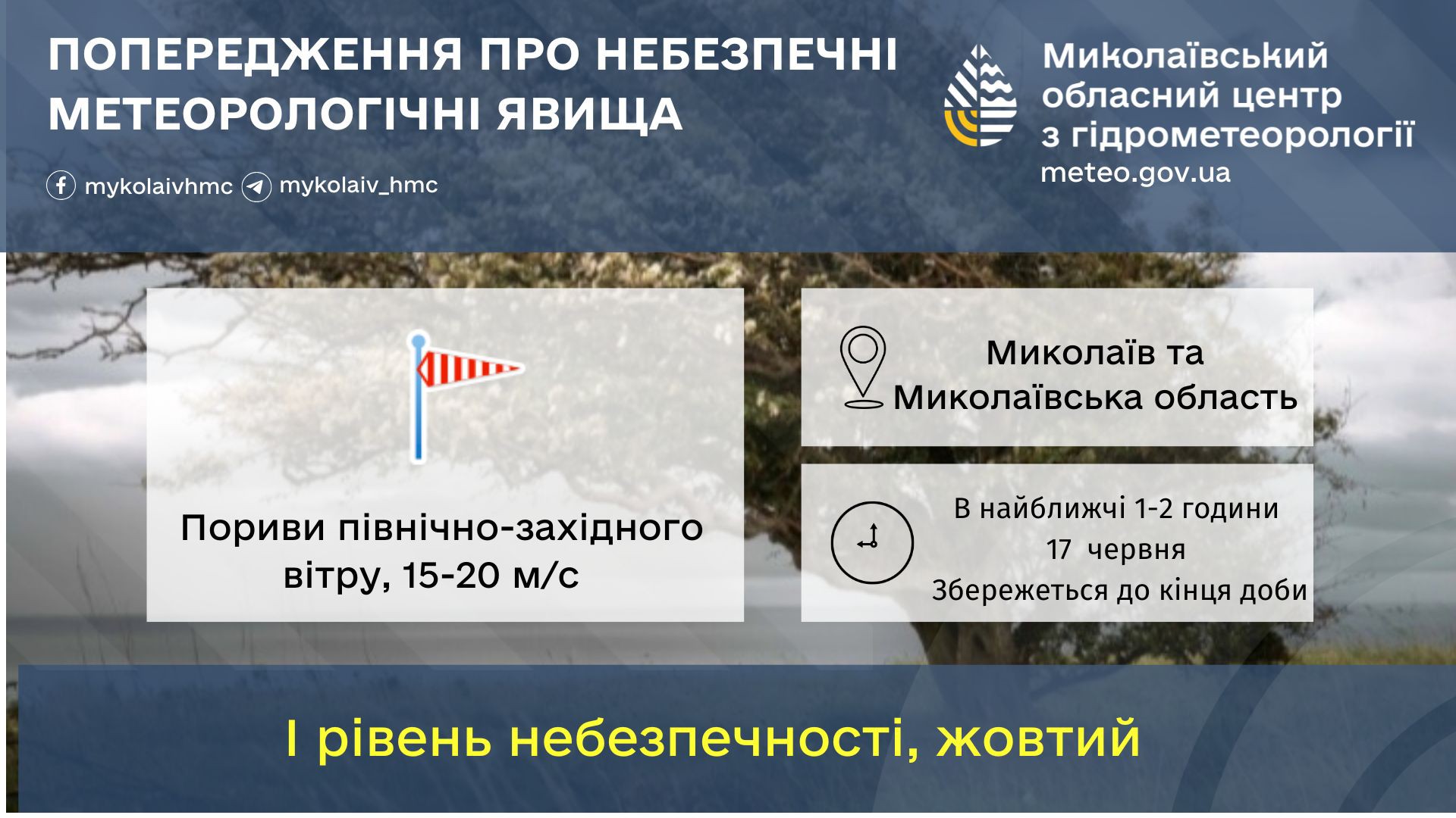 Жителі Миколаївської області та міста Миколаїв, будьте пильними! За повідомленням синоптиків, в найближчі 1-2 години 17 червня 2025 року очікується значне посилення північно-західного вітру. Швидкість вітру може досягати 15-20 м/с.