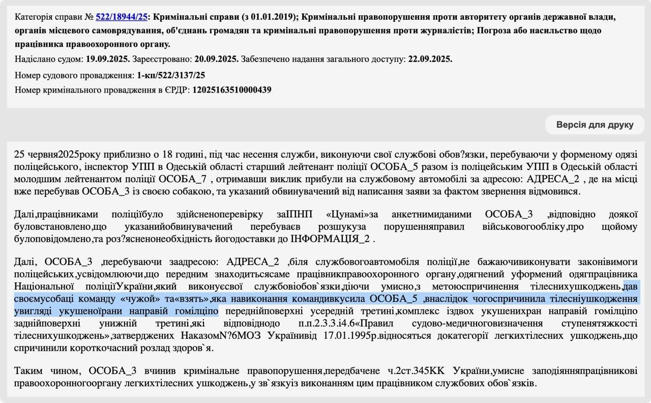 Відповідна інформація міститься в Єдиному реєстрі судових рішень, де детально описано хід справи. Згідно з матеріалами, поліцейські прибули за викликом, і на місці виявили двох чоловіків, один з яких мав при собі собаку. Хоча чоловіки відмовилися писати заяви, поліцейські вирішили перевірити їхні військово-облікові документи. Власник собаки виявився у розшуку за порушення правил військового обліку, що призвело до спроби його затримання.