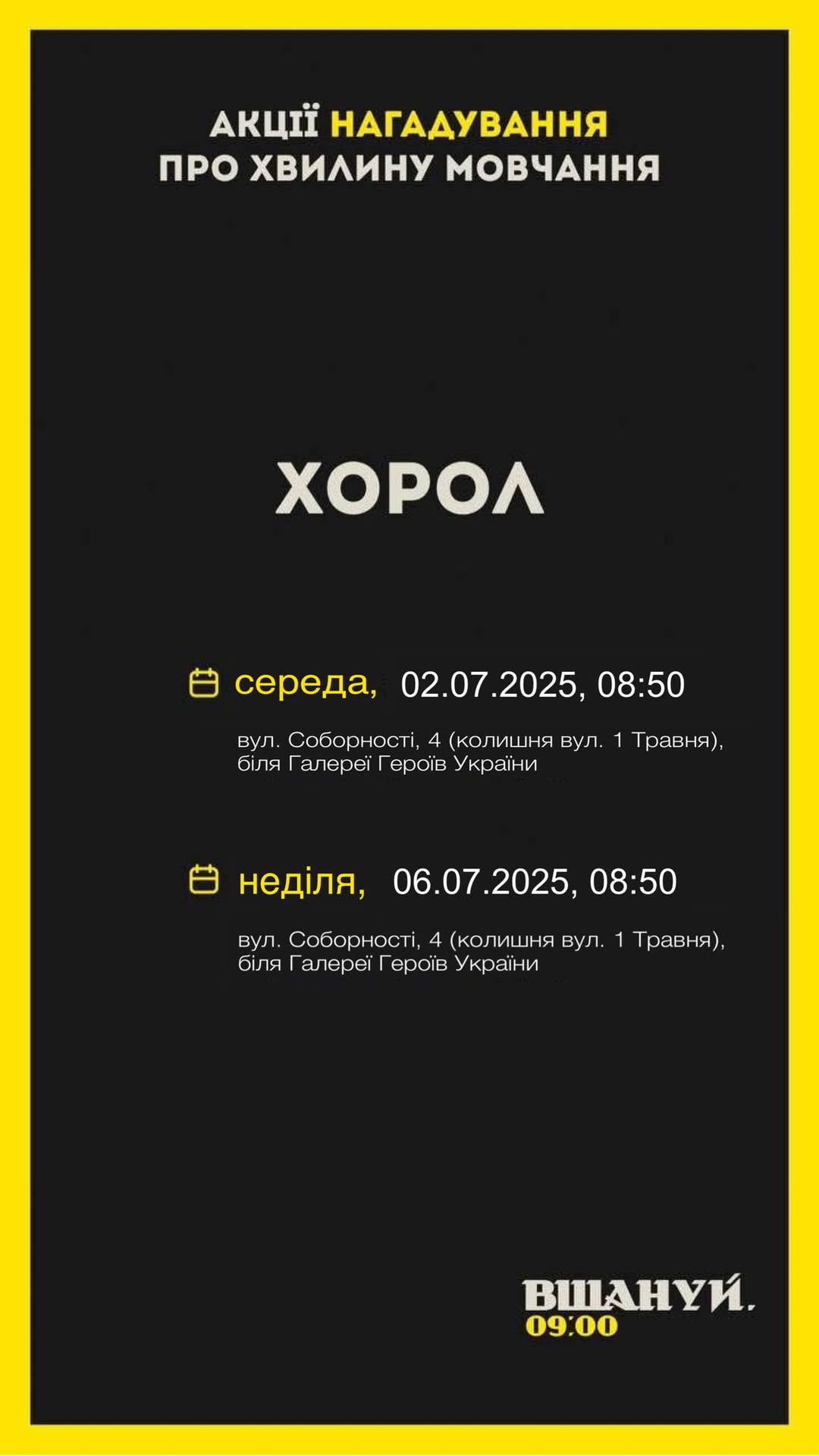 ❗️у неділю (06.07.2025) о 8:50 год. у середмісті Хорола, по вулиці Соборності, 4 біля Галереї Героїв, відбудеться традиційна мирна акція нагадування про хвилину мовчання «Зупинись! Вшануй!».