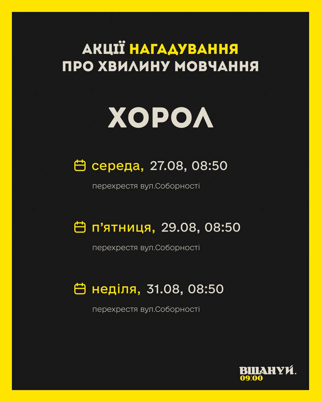 Час проведення: о 8:50 год. у середмісті Хорола, за адресою: вулиця Соборності, 4, біля Галереї Героїв. Акція триватиме орієнтовно з 8:50 до 09:03 год.