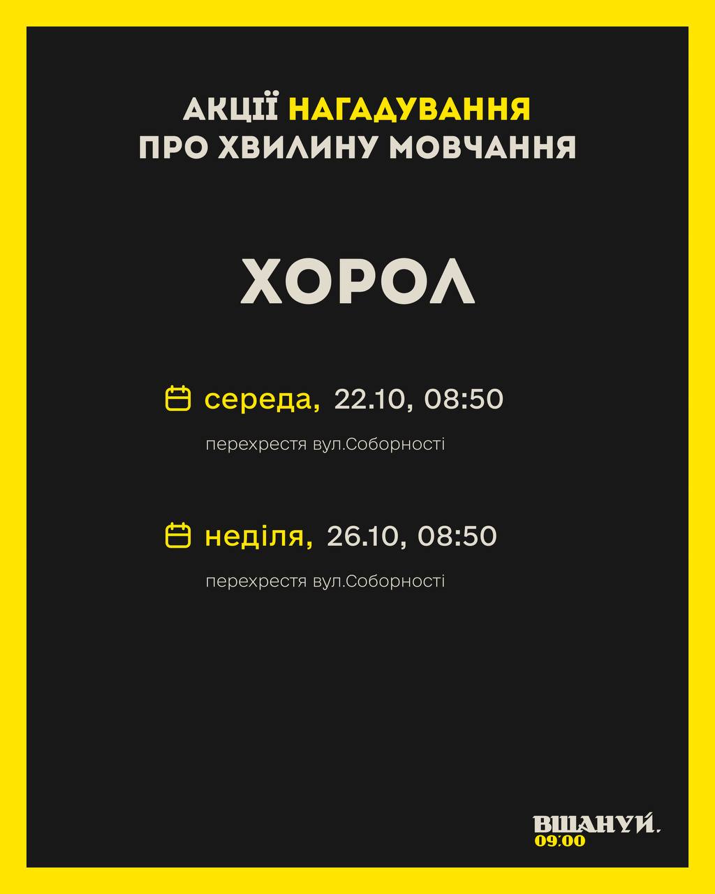 ⏳ Акція триватиме приблизно з 8:50 до 09:05 ранку. Ми щиро закликаємо кожного з вас приєднатися до нас, щоб спільно вшанувати пам’ять наших героїв хвилиною тиші. Крім того, на виконання розпорядження Хорольського міського голови від 27.03.2025 №40-ра, на території Хорольської міської територіальної громади щоранку о 9:00 год. встановлено проведення загальнонаціональної хвилини мовчання. Цей ранковий церемоніал є знаком глибокої поваги до всіх співвітчизників, які загинули внаслідок збройної агресії Російської Федерації проти України, в знак вшанування памʼяті Героїв.