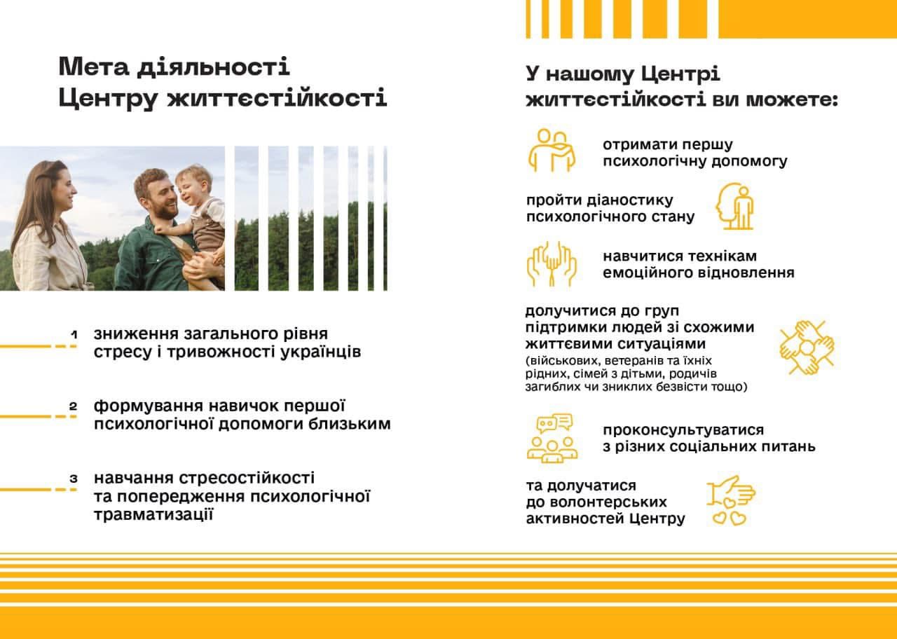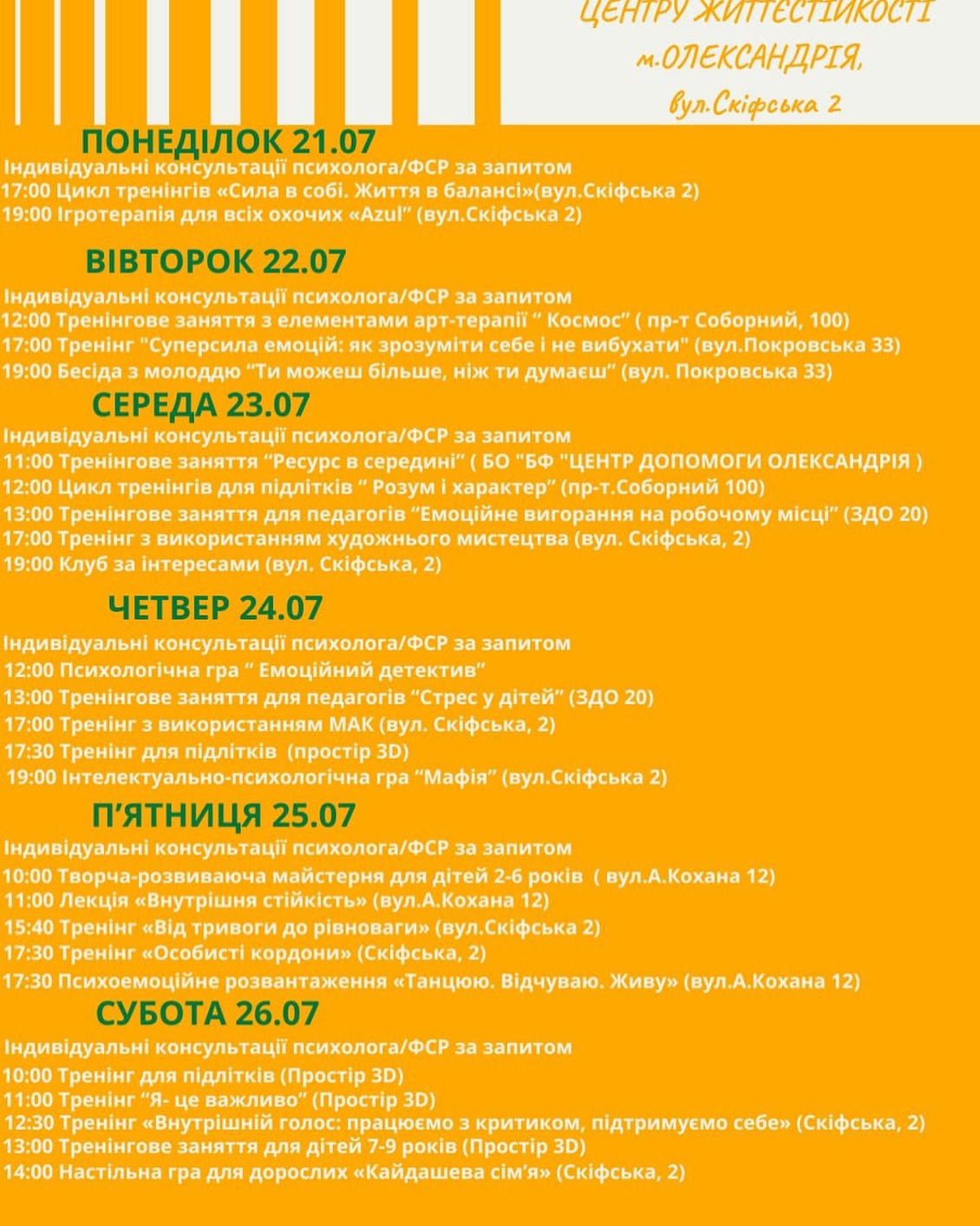 У громаді Олександрії функціонує Центр життєстійкості, пропонуючи підтримку та допомогу мешканцям. Розклад активностей на тиждень з 21 по 27 липня вже доступний для ознайомлення. Центр життєстійкості – це безпечний, дружній та безбар’єрний простір, створений для кожного жителя громади. Тут ви можете безкоштовно отримати кваліфіковану психологічну підтримку, що включає індивідуальні та групові консультації. Окрім того, фахівець із соціальної роботи надає консультації з широкого спектру питань, таких як соціальні послуги, допомога, адаптація та багато іншого. Для тих, хто прагне розвитку та самовдосконалення, Центр пропонує участь у різноманітних групових заняттях, навчальних та терапевтичних тренінгах, лекціях для батьків, клубах за інтересами та групах взаємопідтримки. Це чудова нагода для покращення соціальних навичок та вирішення нагальних питань. Центр розташований за адресою: вулиця Скіфська, 2. Команда Центру також виїжджає на інші локації за попередніми запрошеннями, що робить його послуги ще доступнішими. Протягом тижня команда Центру підготувала насичену програму заходів і щиро запрошує всіх охочих долучитися. Разом ми можемо творити сильну, життєстійку спільноту, де кожен відчуває підтримку. – Наше головне завдання – підтримка ментального здоров’я населення у цей непростий для країни час. Не вагайтеся звертатися по допомогу, адже важливо не залишатися на самоті зі своїми проблемами! – наголошують представники Центру життєстійкості. Для реєстрації на активності або для отримання консультації, будь ласка, зв’яжіться з нами за телефоном або через соціальні мережі. Номер телефону: 0731425382. Наші сторінки у соціальних мережах: Фейсбук: https://www.facebook.com/profile.php?id=61576953000321; Інстаграм: https://www.instagram.com/centrgs?igsh=MTBqeHUzajU1OW15bA==; Телеграм: https://t.me/centrGS. Цей проєкт реалізується за підтримки Міністерства соціальної політики України і є частиною Всеукраїнської програми ментального здоров’я «Ти як?», започаткованої Першою леді Оленою Зеленською, а також громадської організації «ВІДЧУВАЙ».