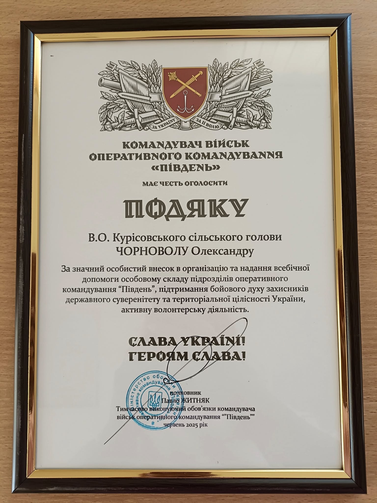 В. о. Курісовського сільського голови мав за честь від імені Курісовської громади отримати подяку від командування Третьої штурмової бригади та оперативного командування “Південь” за систему підтримку, яку наша громада надає захисникам.