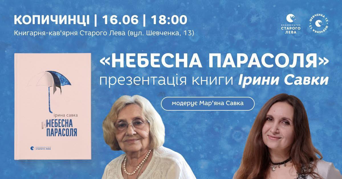 ✨Запрошуємо на зустріч з книгою «Небесна парасоля» Ірини Савки у Копичинцях! У понеділок, 16 червня, Книгарня-кав’ярня Старого Лева в Копичинцях стане місцем щирої розмови про книгу «Небесна парасоля».