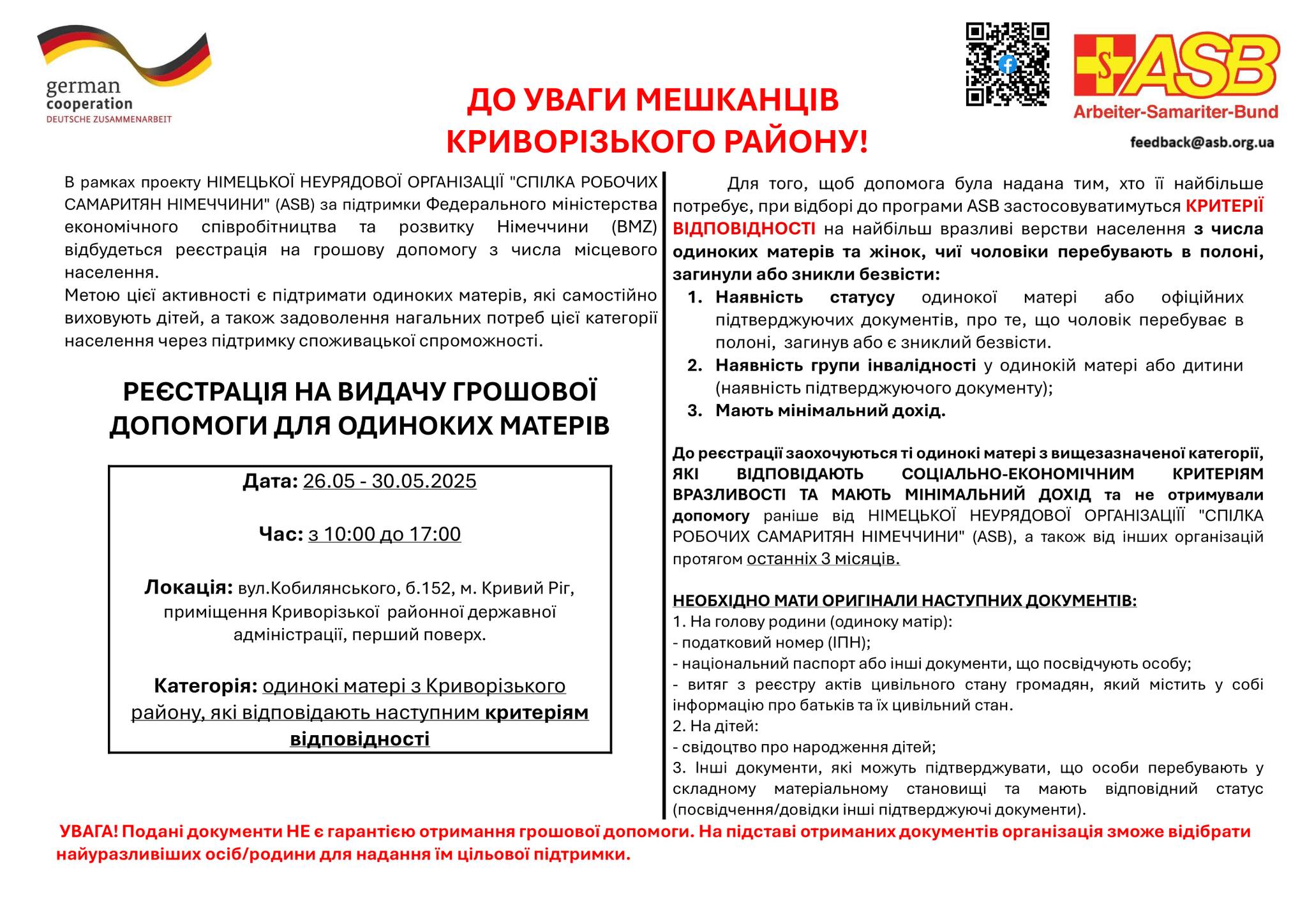 У Кривому Розі триває реєстрація на отримання грошової допомоги для одиноких матерів, яка здійснюється в рамках проекту НІМЕЦЬКОЇ НЕУРЯДОВОЇ ОРГАНІЗАЦІЇ “СПІЛКА РОБОЧИХ САМАРИТЯН НІМЕЧЧИНИ” (ASB) за підтримки Федерального міністерства економічного співробітництва та розвитку Німеччини (BMZ). Ця ініціатива спрямована на підтримку одиноких матерів, які самостійно виховують дітей, а також на задоволення їхніх нагальних потреб шляхом покращення споживацької спроможності.