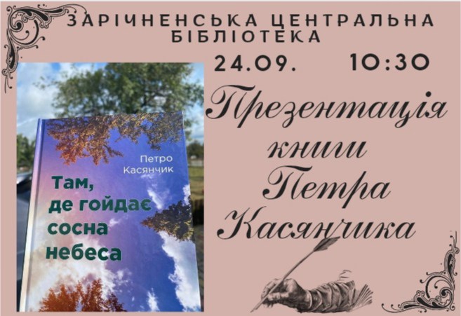 📣 У середу, 24 вересня, в Зарічненській центральній бібліотеці відбудеться урочиста презентація поетичної збірки «Там, де гойдає сосна небеса». Цей видатний твір є світлою пам’яттю про талановитого поета Петра Касянчика, чия творчість залишила глибокий слід у серцях поціновувачів поезії.