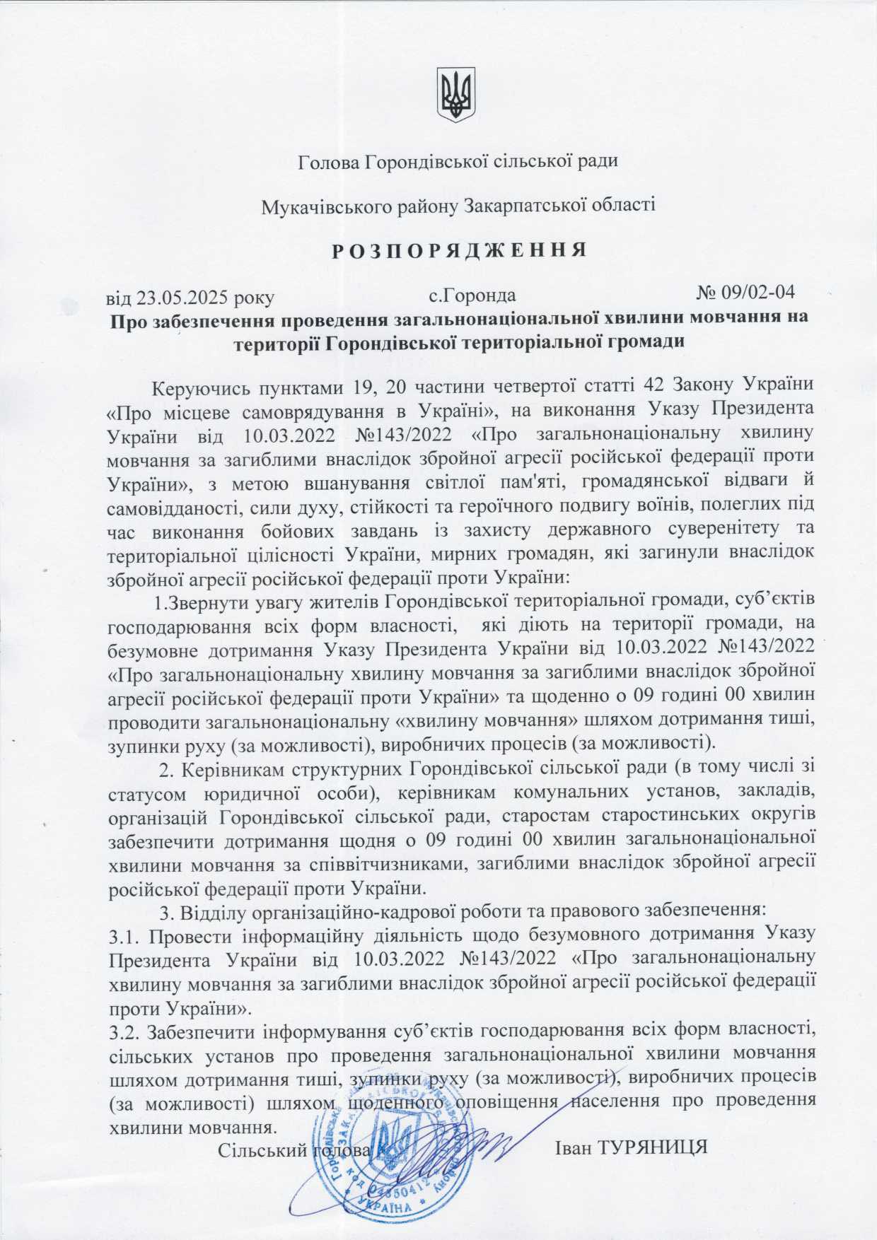 Важливо, щоб трудові колективи громади, комунальні заклади та підвідомчі установи дотримувалися вимог Указу Президента України про загальнонаціональну хвилину мовчання. Необхідно інформувати кожного працівника та забезпечити їхню участь у вшануванні пам’яті наших Героїв, які віддали свої життя за Україну, та мирних громадян, які загинули внаслідок збройної агресії росіян проти України. Кожна хвилина мовчання – це нагадування про ціну, яку ми платимо за мир.