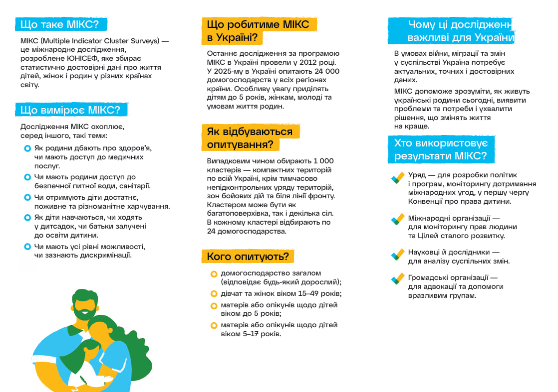 Державна служба статистики разом з Інститутом демографії та досліджень якості життя імені Михайла Птухи НАН України та ГО “Український центр соціальних реформ” за підтримки Дитячого фонду ООН (ЮНІСЕФ) в Україні розпочала реалізацію чергового раунду Мультиіндикаторного кластерного обстеження домогосподарств (МІКС) в Україні, організація та проведення якого передбачається протягом 2025–2026 років.